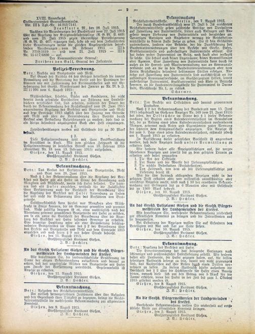 Tiefe Polizciverordnuna tritt mit ihrer Veröffentlichung rin Kreisblatt in Kraft. Mit dem gleichen Zeitpunkt ist die Polizeiverordnung in demselben Betreff vom 18. Februar 1915 (Kreisblatt Nr. 18 vom 19. Februar 1915) ansgehoben. Gießen, den 11. August 1915.