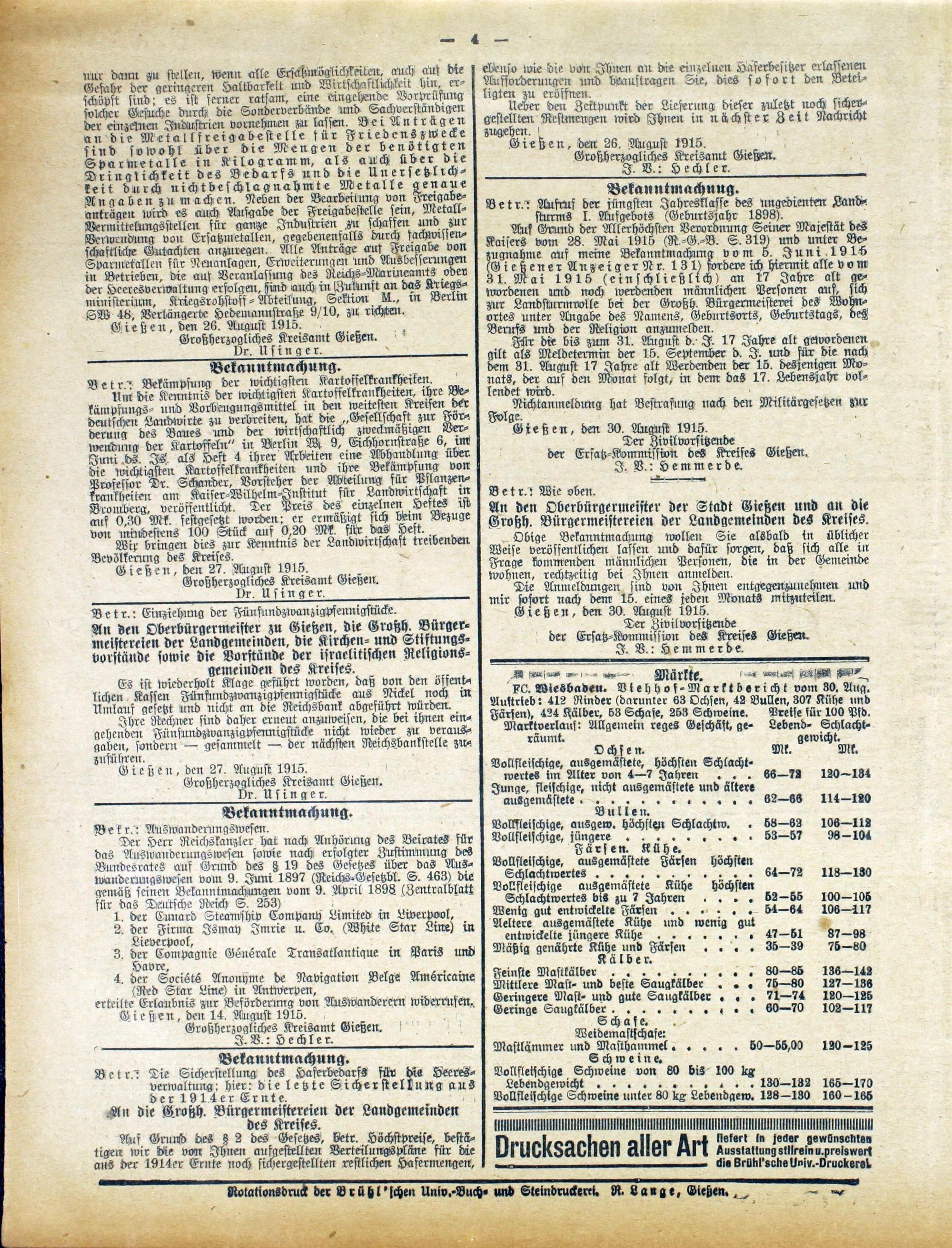 Die Anmeldungen sind von Ihnen entgegenzunehmen und mir sofort nach dem 15. eines jeden MonatS mitznteilen, Gießen, den 30, August 1915,
