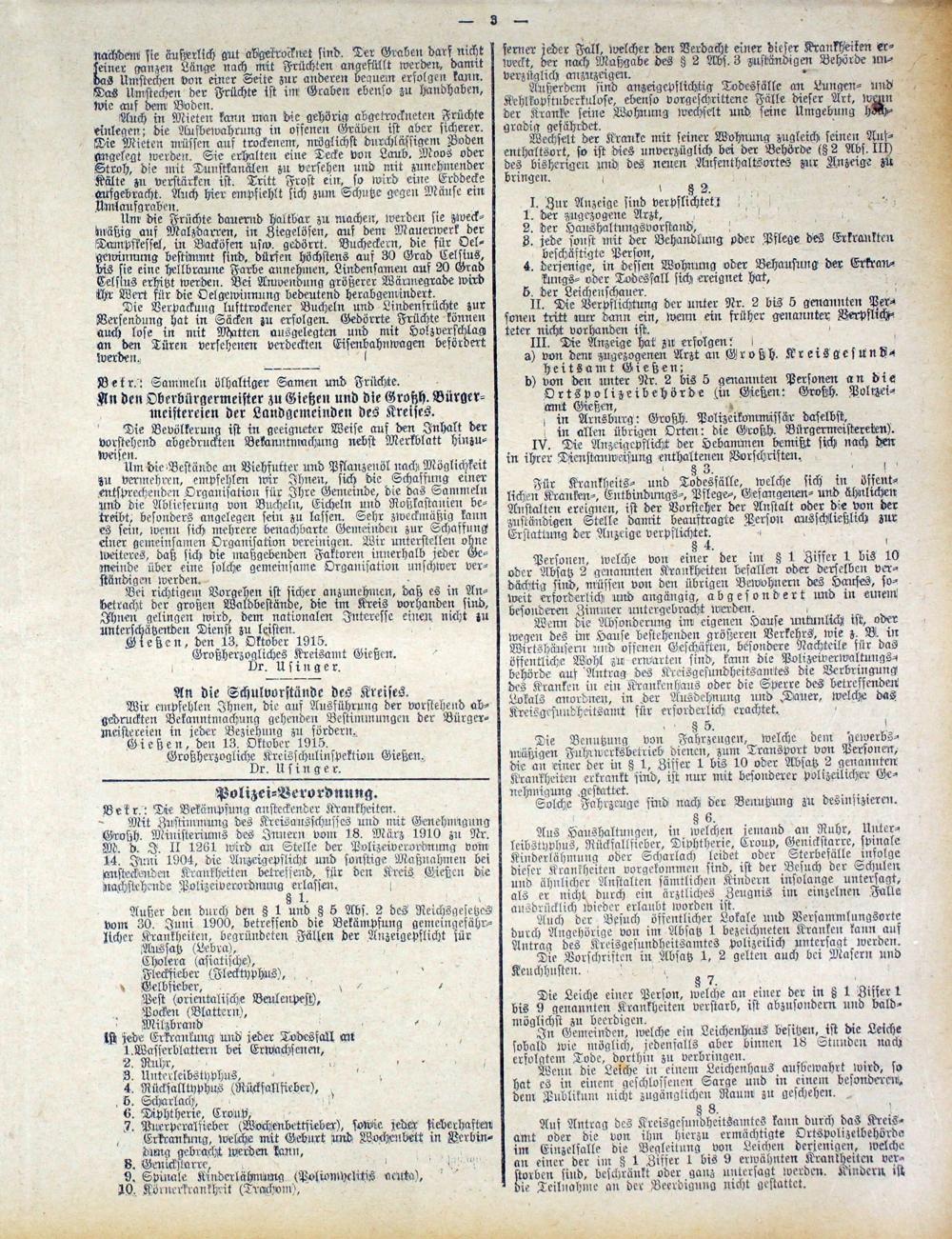 Mit Zustimmung des Kteisansschusses und mit Genehmigung Großh, Ministeriums des Innern vom 18, März 1910 zu Nr. W, d, I, II 1281 wird an Stelle der Polizeiverordnnng vom 14, Juni 1904, die Airzeigepftrcht und sonstige Maßnahmen bei janstcck>on,d«i Krailkheiten betreffend, für den Kreis Gießen die Nachstehende Polizciveoordnung erlassen, |