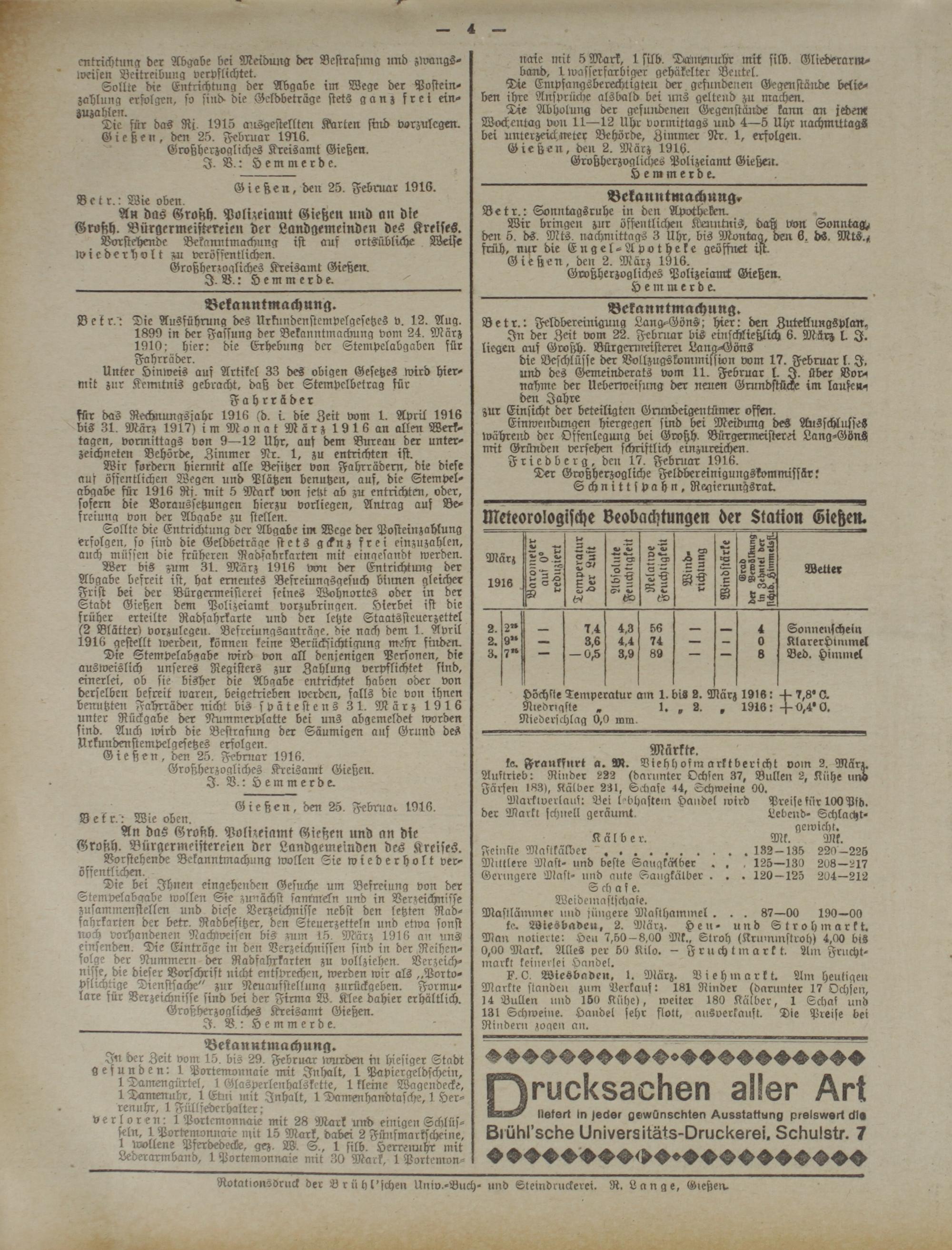 Wer bis zum 31. März 1916 von der Entrichtung der Abgabe befreit ist, hat erneutes Befreiungsgesuch binnen gleicher Frist bei der Bürgermeisterei seines Wohnortes oder in der Stadt Gießen dem Polizeiamt vorzubringen, hierbei ist die früher erteilte Radsahrkarle und der letzte Staatssteuerzettel (2 Blätter) vorzulegen. Befreiungsanträge, die nach dem 1. Avril 1916 gestellt werden, können keine Berücksichtigung mehr finden.