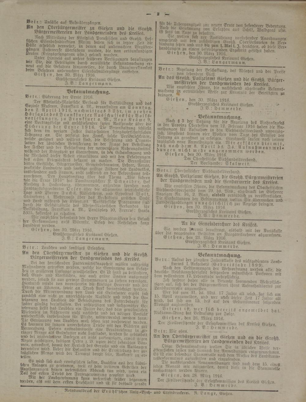 Biehhaude^verbands vom 29. ds. Mts., abgedruckt im G ebener Anzeiger Nr. 76, 2. Blatt, alsbald ortsüblich zu veröffenmL r (t w ngen der Besttminnngen wollen Sie überwachen und Zuwiderhandlungen unnach sichtlich zur Anzeige bringm. Gießen, den 30. März 1916.