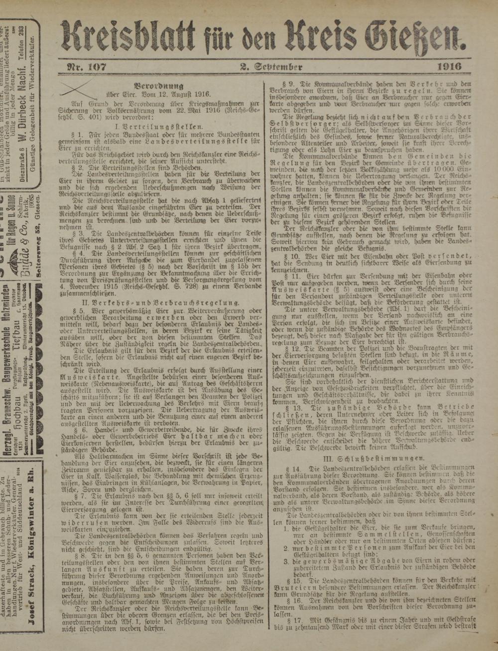 Ans Grund der Verordnung über Kriegsnraßnahmen zur Sicherung der Bvlksernährung von: 22. Mai 1916 (Reichs-Ge- setzbl. S. 401) ivird verordnet: