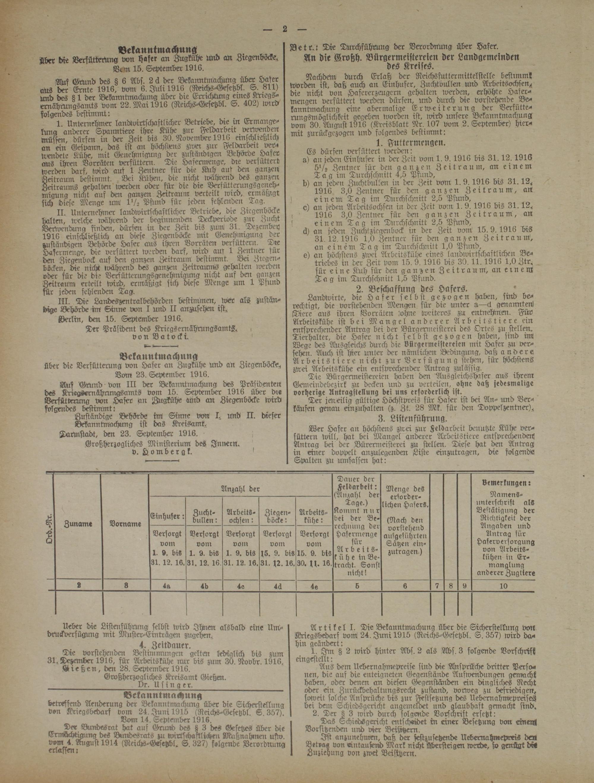 Tie vorstehenden Bestimmungen gelten lediglich bis zum 31. Dezember 1916, für Arbeitskühe nur bis zum 30. Novbr. 1916. Gießen, den 26. September 1916.