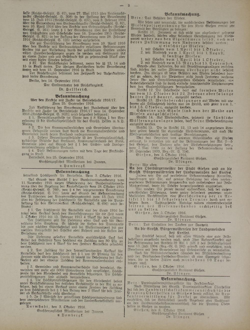 An den Oberbürgermeister der Stadt Gießen und an die Großh. Bürgermeistereien der Landgemeinden des Kreises.