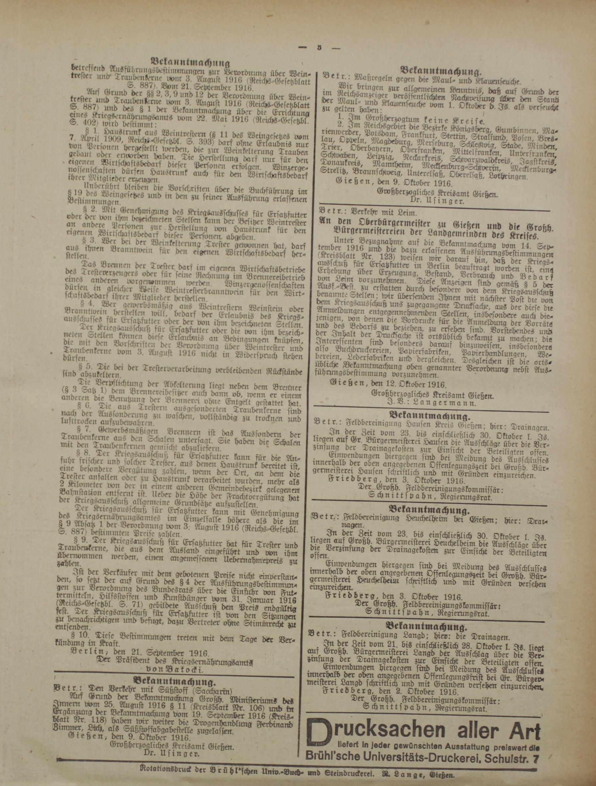 ^raänrnna^^ß Au^st 1916 § 11 (Kreisblatt Nr. 106) und in ErgäiiMig der Bekamitnlachmng vom tlt September 1916 ölfltt J(T. 118) haben wir weiter die DvogenHandluna s?ert>inanh a [& -L>üßstoffabgabestelle zugelassen Gießen, deri 9. Oktober 1916.