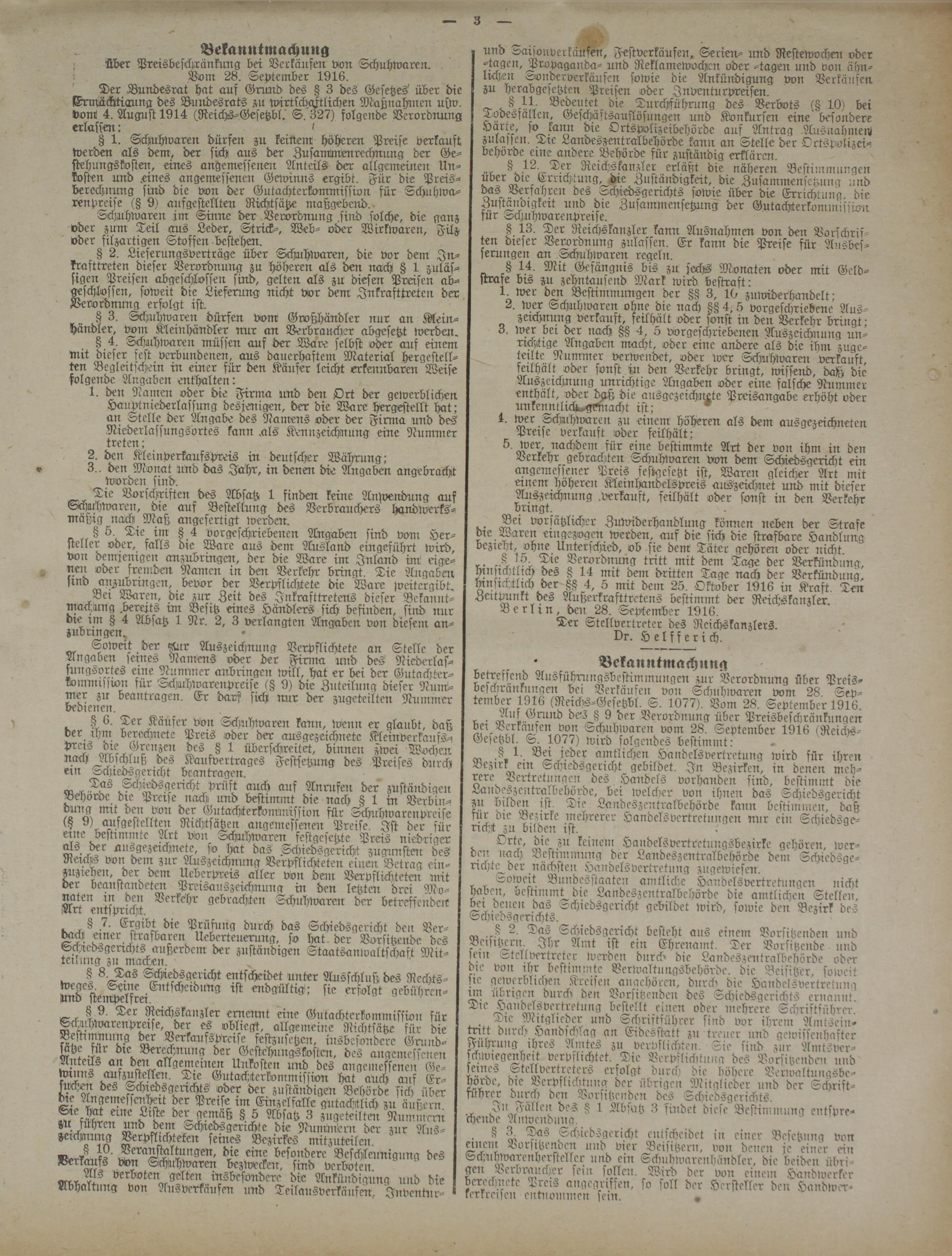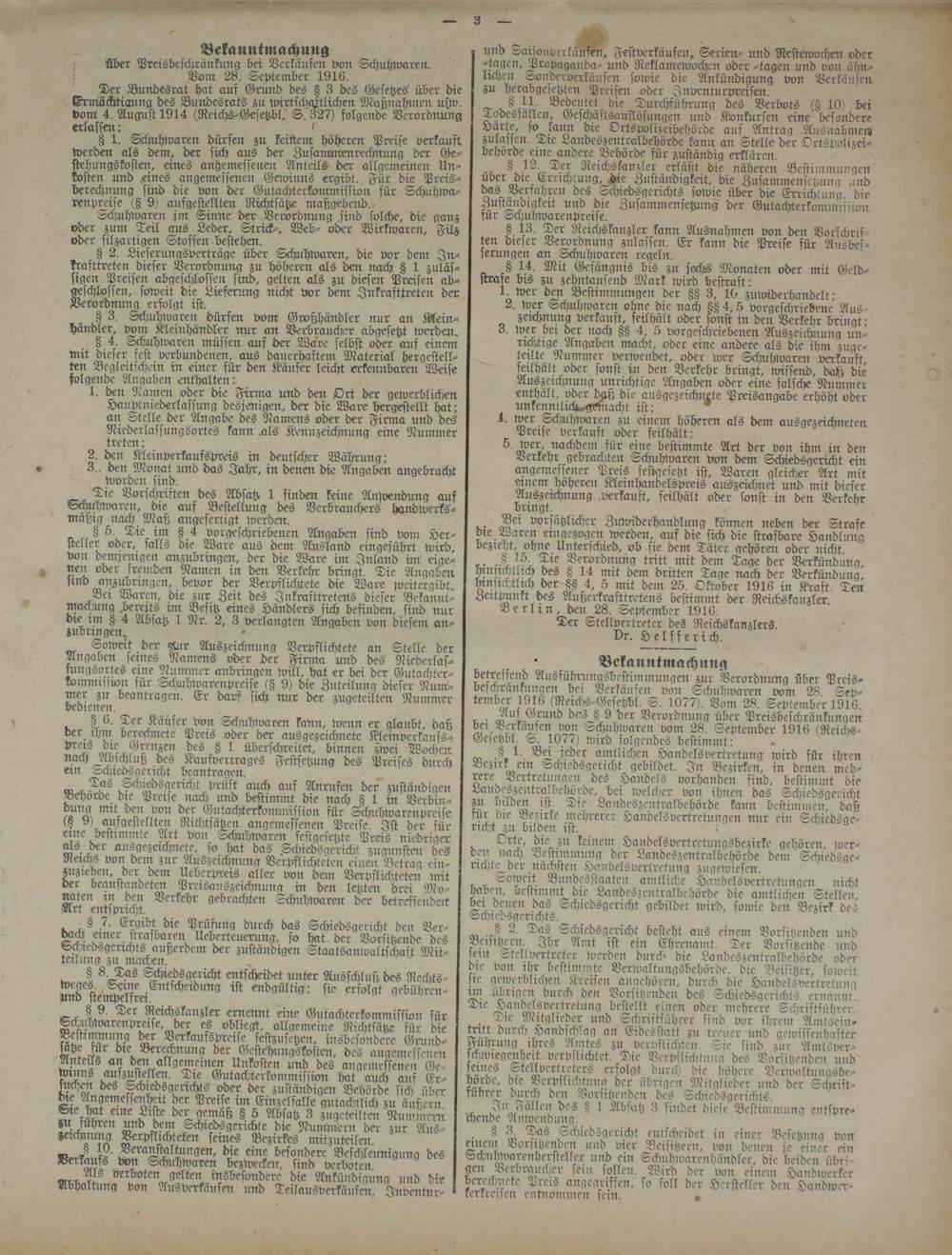 betreffend Ausführungsbestiinmungen zur Verordnung über Preisbeschrankungen bei Verkäufen von Schnhwaren vom 28. Sep- tember 1916 (Re:chs-Gesetzbl. S. 1077). Vom 28. September 1916. r, . Griilid des 8 9 der Verordnung über Preisbeschränkungen vei Verkaiften von Schuhwaren vom 28. September 1916 iReichs- Gefttzbl. S. 1077) wird folgendes bestimmt: cv A 1 *. amtlichen Handelsvertretung wird für ihren