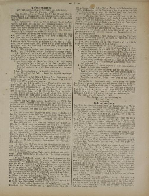 Bei vorsätzlicher Zuwiderhandlung können neben der Strafe die Waren e:ngezogen werden, auf die sich die strafbare Handlung bezieht, ohne Unterschied, ob sie dem Täter gehören oder nicht .. A Verordnung tritt mit dem Tage der Verkündung, PUfliMtlich des § 14 mit den: dritten Tage nach der Verkündung, hinsichtlich der §§ 4, 5 mit dem 25. Oktober 1916 in Kraft. Ten Zeitpunkt des Llußerkrafttrctens bestimmt der Reichskanzler. Berlin, den 28. September 1916.