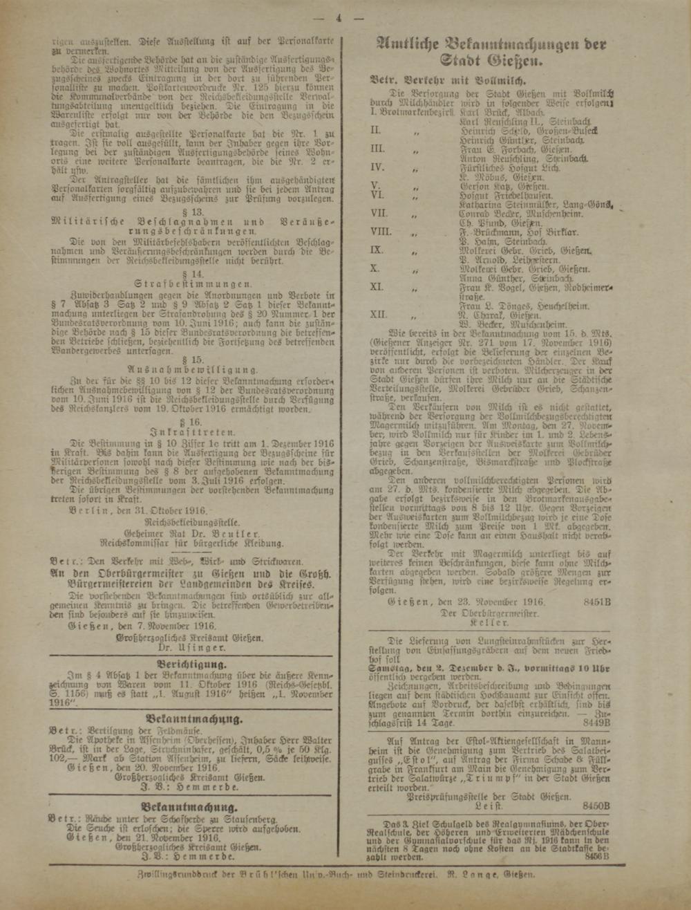 Wie bereits in der Bekanntmachung vom 15. d. Mts. (Gießener Anzeiger Nr. 271 vom 17. November 1916) veröffentlicht, erfolgt die Belieferung dn einzelnen Bezirke nur durch die vorbezeichneten Händler. Der Kauf von anderen Personen ist verboten. Mttcherzeugec in der Stadt Gießen dürfen ihre Milch nur an die Städtische Verbeilungsstelle, Molkerei Gebrüder Grieb, Schanzenstraße, verkaufen.