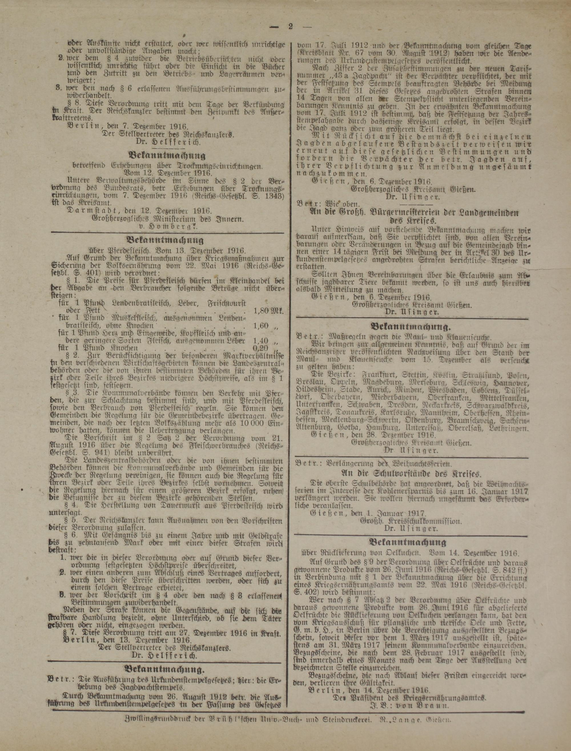 Tie Bezirke: Frankfurt, Stettin, Köslin, Strcchlsund, Posen, Breslau, Oppeln, Magdeburg, Merseburg, Schleswig, Hannover, Hildesheiiu, Stade. Aurich, Minden, Wiesbaden, Eobtenz, Düssel- liorf, Oberbaßcru, Mederbaperu, Oberfranken, Mittclfrankeu, Unterfrankeu, Schwaben, Dresden, Neckarkreis, Schwarz waldkreis, Jagstkreis, Donaukreis, Karlsruhe, Mannheim, Oberhessen, Rhein- Hessen, Mecklenburg-Schwwrin, Oldenburg, Braun schweig, Sachsen- Altenburg, Gotha, Hamburg, Nuterelsaß, Oberelsaß, Lothringen. Gießen, den 28. Dezember 1916.