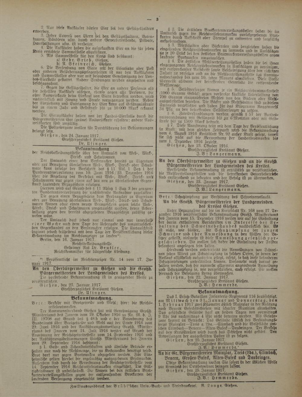 Vorstehende Bekanntntachung ist ortsüblich zu veröffentlichen, die Mehlverteilungsstellen utrd die betreffenden Gewerbebetriebe sind entsprechend zu bedeuten und der Befolg ist zu überwachen, Gießen, der: 23. Januar 1917.