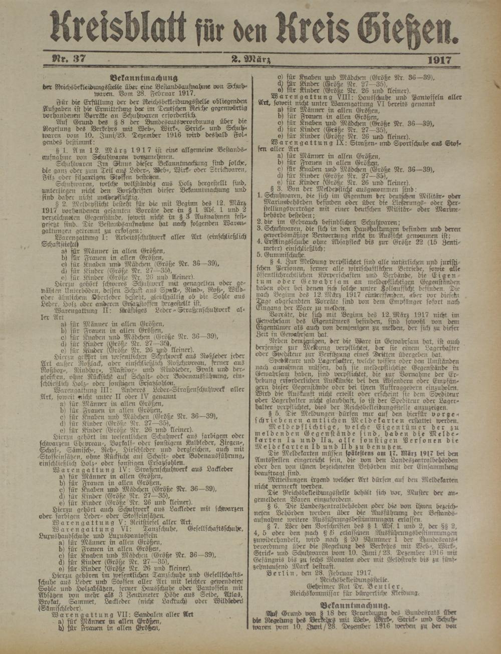 der Reichsbekleibungsstelle über eine BestLirbsiiu.fna.hlne von Ächuh- Waren. Vom 28. Februar 1917.