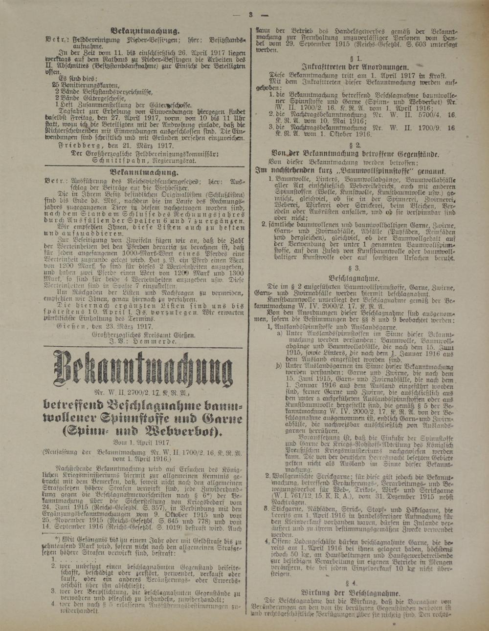 1. die Bekanittnmchung betreffend Beschlagnahme baumwollener Spinnstoffe und Garne (Spinn- und Webverbot) Nr. (W. II. 1700/2. 16. K. R. A. vom 1. April 1916;