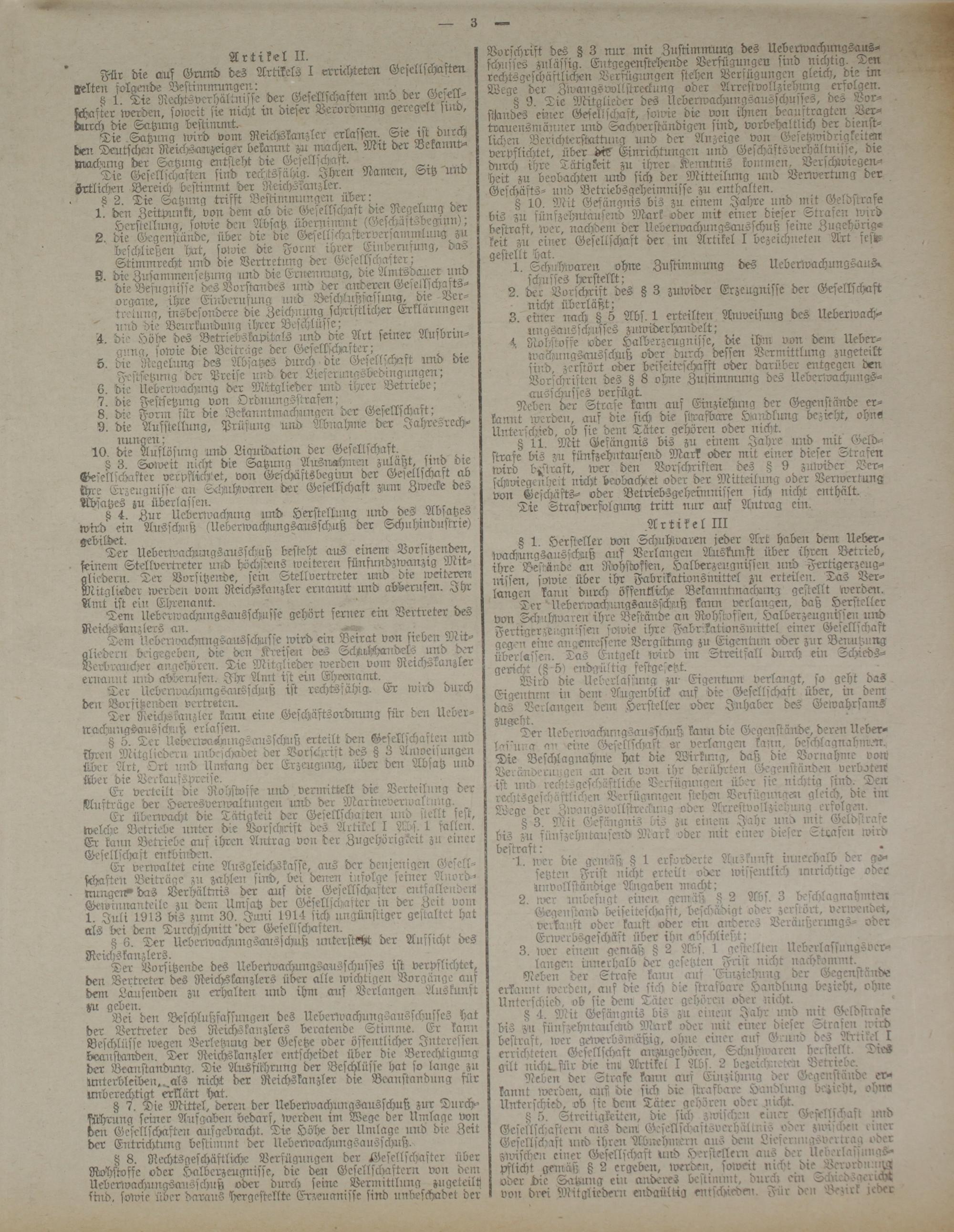 8 4. Mit Gefängnis bis zu einem Jahr und mit Geldstrafe bis zu fünfzehntausckrd Mark oder mit einer dieser Strafen wird bestraft, wer gewerbsmäßig, ohne einer auf Grund des Artikel I errichteten GeseNsck>aft anMgehören, Schuhlvaren berftellt. Die» gilt uichtt ftir die inr Artikel I Abs. 2 bezcichnetein Betriebe