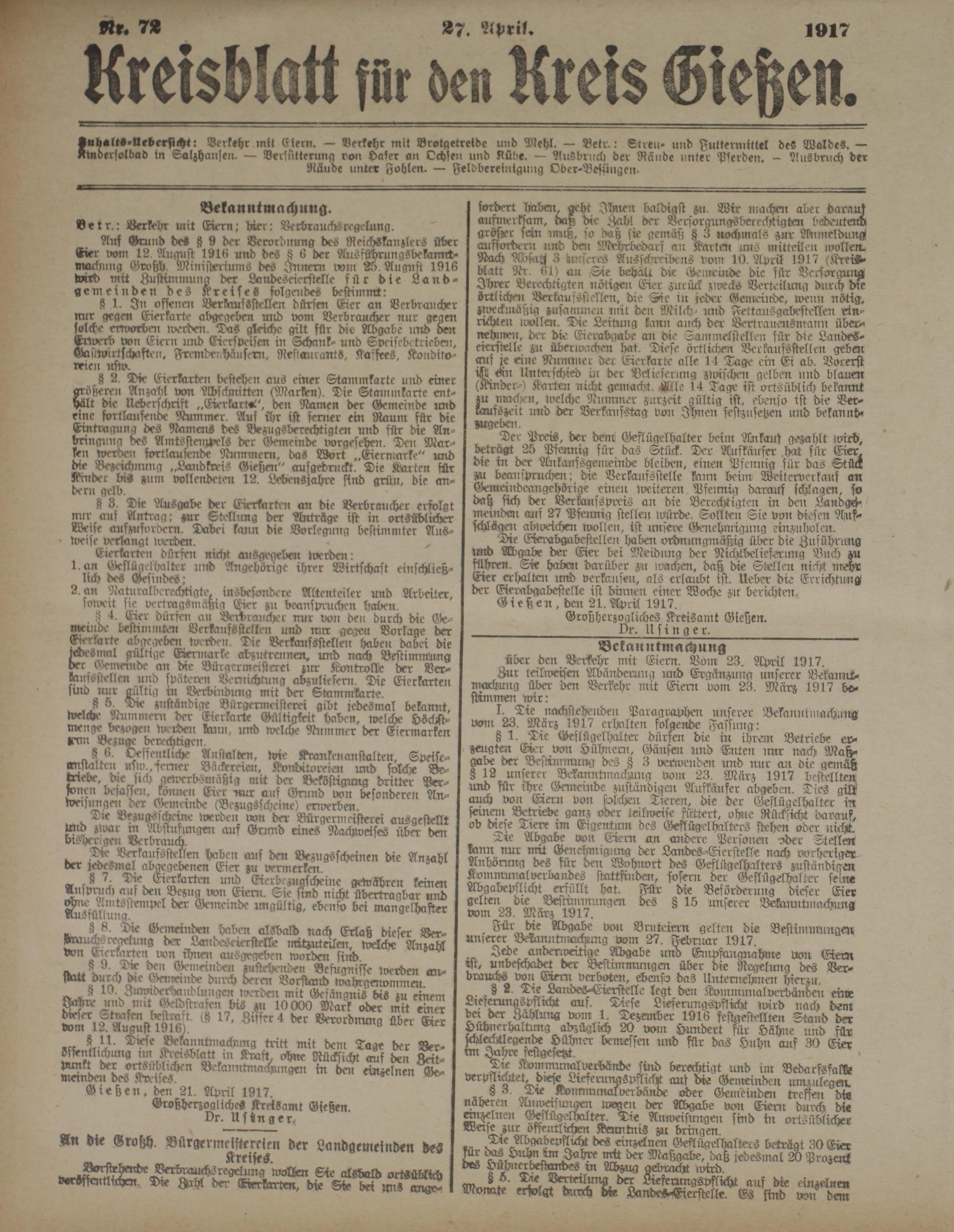 vb«lt»-lleberfrchi: Verkehr mit Eiern. — Verkehr mit Brotgetreide und Mehl. — Betr.: Streit- und Futtermittel des WaldcS. — Inoersolbad in Salzhansen. — Dersntterung von Later an Ochsen und Rühe. — AuSbruch der Räude unter Pferden. - Ausbruch der