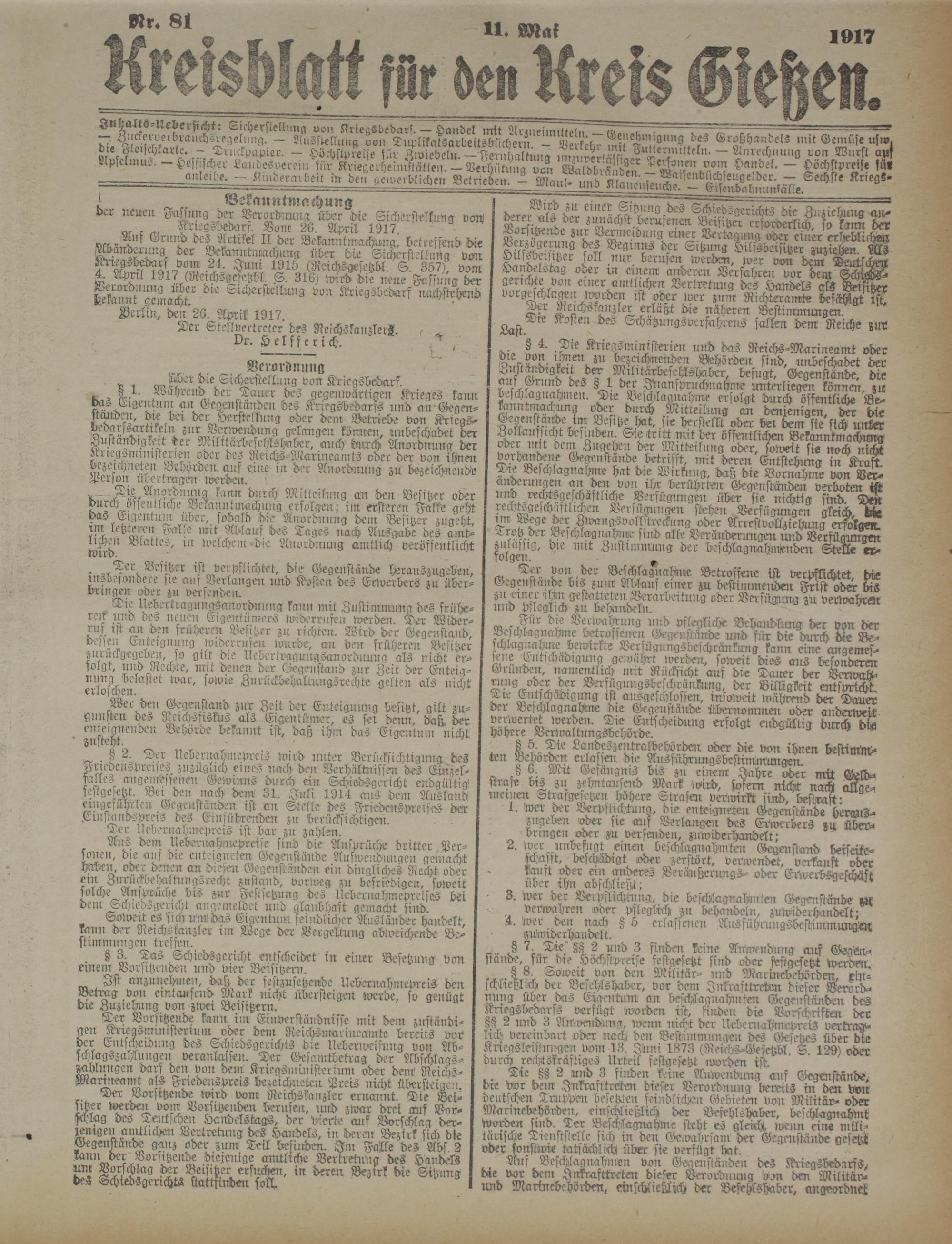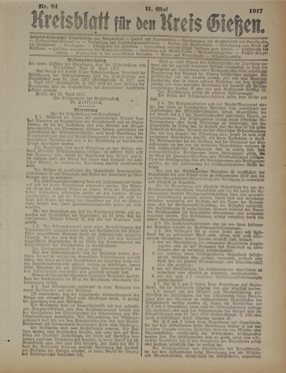 8 1. wahrend der Dauer des gegenwärtigen Krieges kann da-. Eigentum an Gegenständen des Kriegsbedarfs und an-Gegenständen, die der der Herstellung oder dem Betriebe von Kriegs- dedarssartrkeln zur Verwendung gelangen können, unbeschadet der Zuständigkeit der MilttärbefehlsHaber, auch durch Anordnung der Kilegvmliii)tenen oder des Reichs-Marineamts oder der von ihnen Gezeichneten Behörden auf eure in der Anordnung zu bezeichnende Person iwer tragen werden.