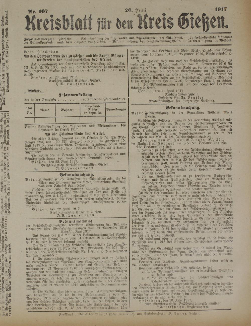 Snhalts-Ueberttcht: Flachsbau. - Schlußprüsung der Aspiranten und Aspirantinnen des Schulamts. — Landespolizeiliche Abnahme der Schnmlspurdahn nach dein Bah.chos Lang Göns. - Bekannt,nachmig der Ne,chsbekle,dnngsstelle. — Feldbereungung m Röthges.