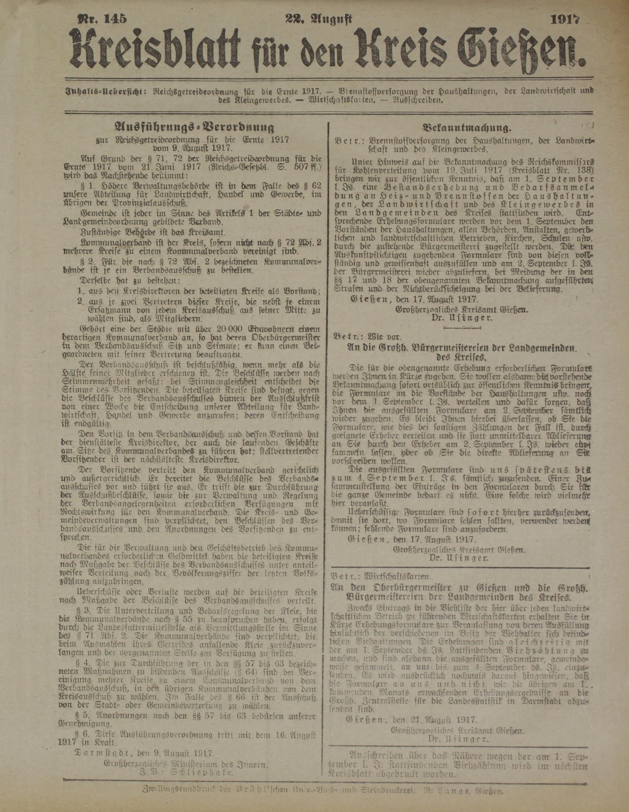 Kur Nn-chsgetreideordnung für die Ernte 1917 vom 9. August 1917.