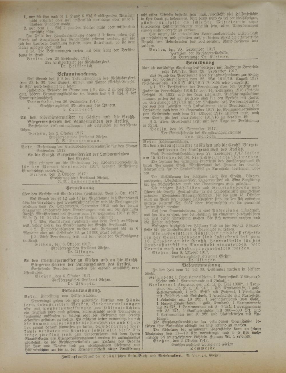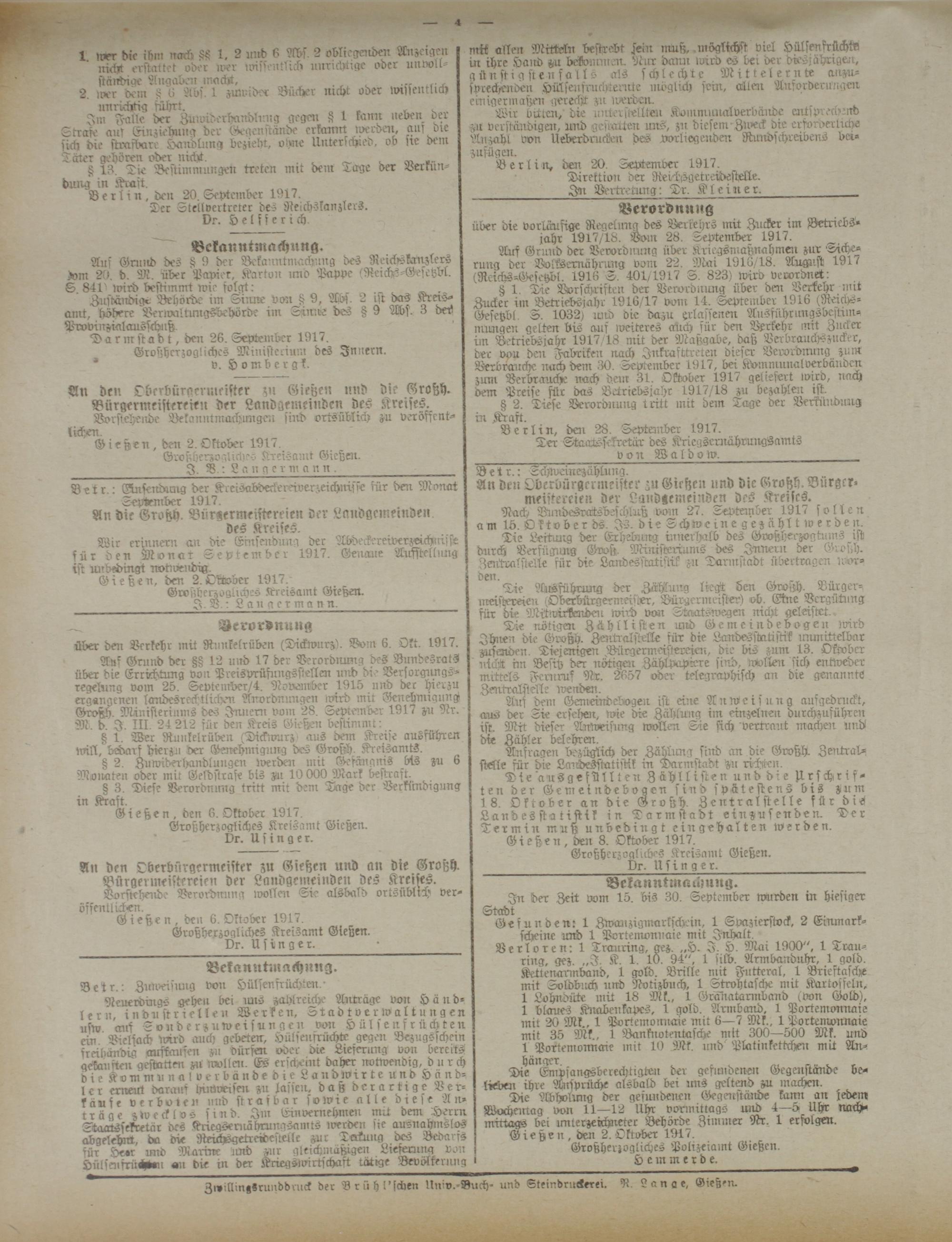 Auf Grund der §§ 12 und 17 der Verordnung des Bundesrats über die Errichtung von Preisprüfungsstellen und die Versorgimgs- regeln ug vom 25. Sevtember/4. November 1915 und dec hierzu ergangenen landesrechtlichen Anordnungen nürd mit Genehmigung Grosth. Ministeriums des Innern vorn 28. September 1917 zu Nr. M. d. I. III. 24 212 für den Kreis Giesten bestimmt: