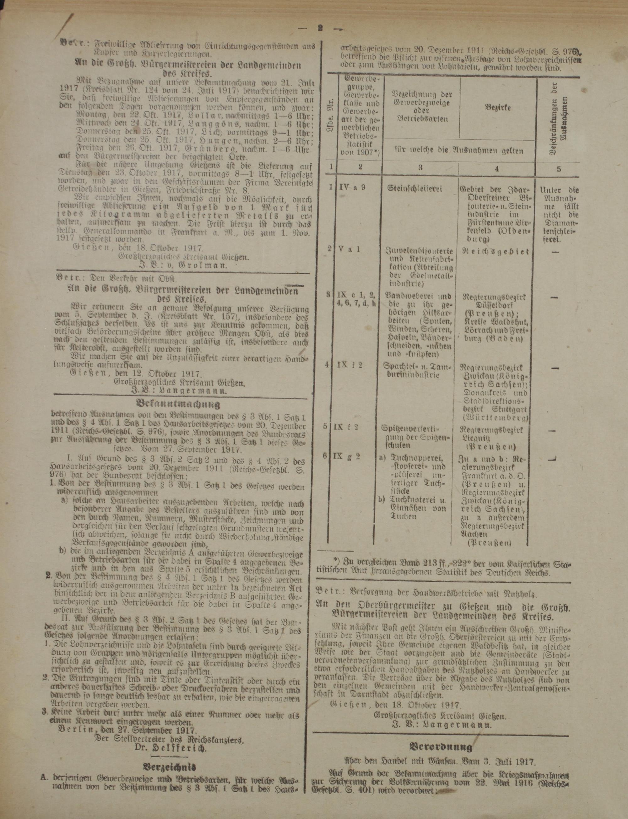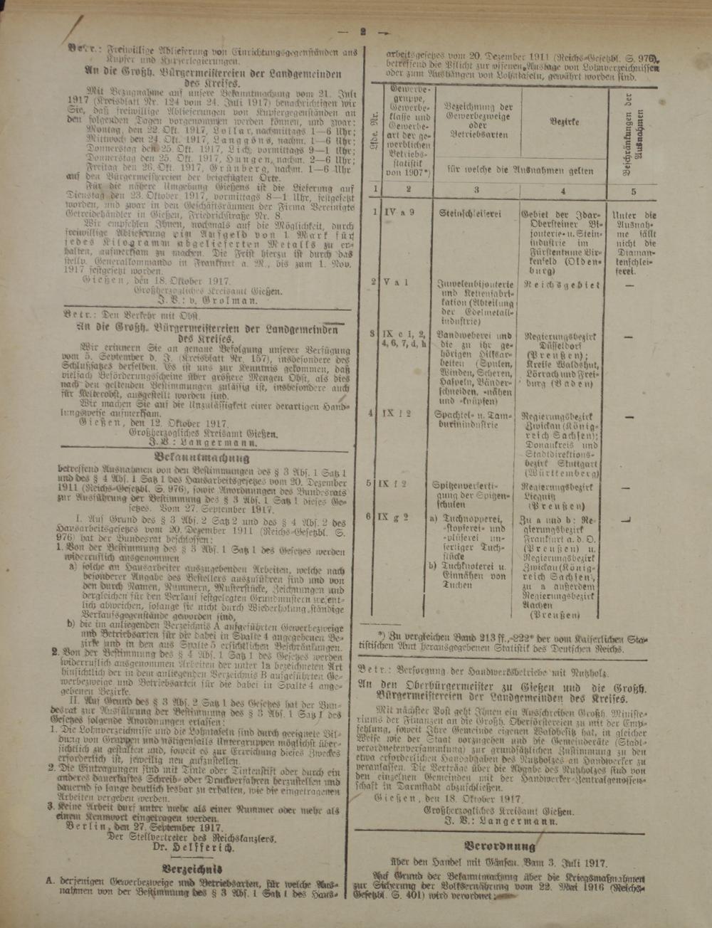 Berfanssgogenstande geuwrdcn sind, d) dl^r m anlieg enden Verzeichnis A ausgesührten Geiverbezweiae söetpÄÄflflrtcn sür dre dabei in Spalte 4 angegebnen. Bett c» 5 l r * Ä m dm aus Smtie 5 ersichtlichst Beschränlün.ken r.^Von der Bestimmung des 8 4 2lbs. 1 Satz ! des ,-tzeselsts -werden ^errufUch ausgenommen Arbeiten der mtter la bezeichueteu Art hinsichtlich der in dem anliegenden Verzeichnis B aufgeführte.-i Gc- werbezweige und Betriebsarten snr die dabei in Spalte 4 angegebenen Bezirke.