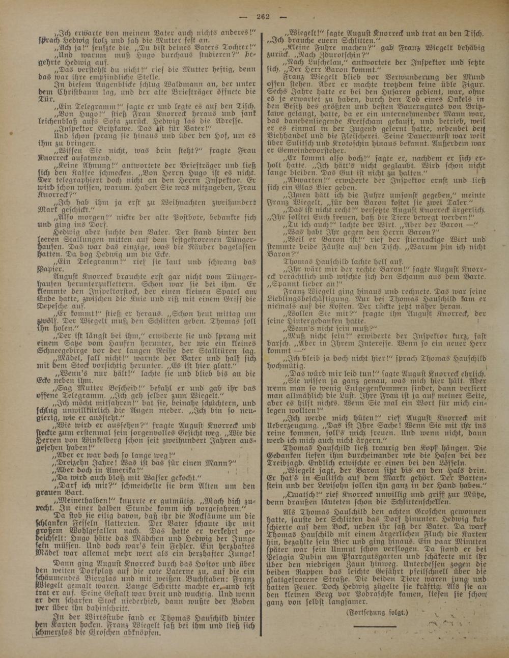 Dann ging August Knorreck durch das Hostor und über den weiten Dorsplatz auf die rote Laterne zu, auf die ein schäumendes Bierglas und mit weißen Buchstaben: Franz Wiegelt gemalt waren. Lauge Schritte machte er, und fest trat er auf. Seine Gestalt war breit und wuchtig. Und wenn er den scharfen Stock nicderhicb, dann wußte der Boden wer über ihn dahinschritt.