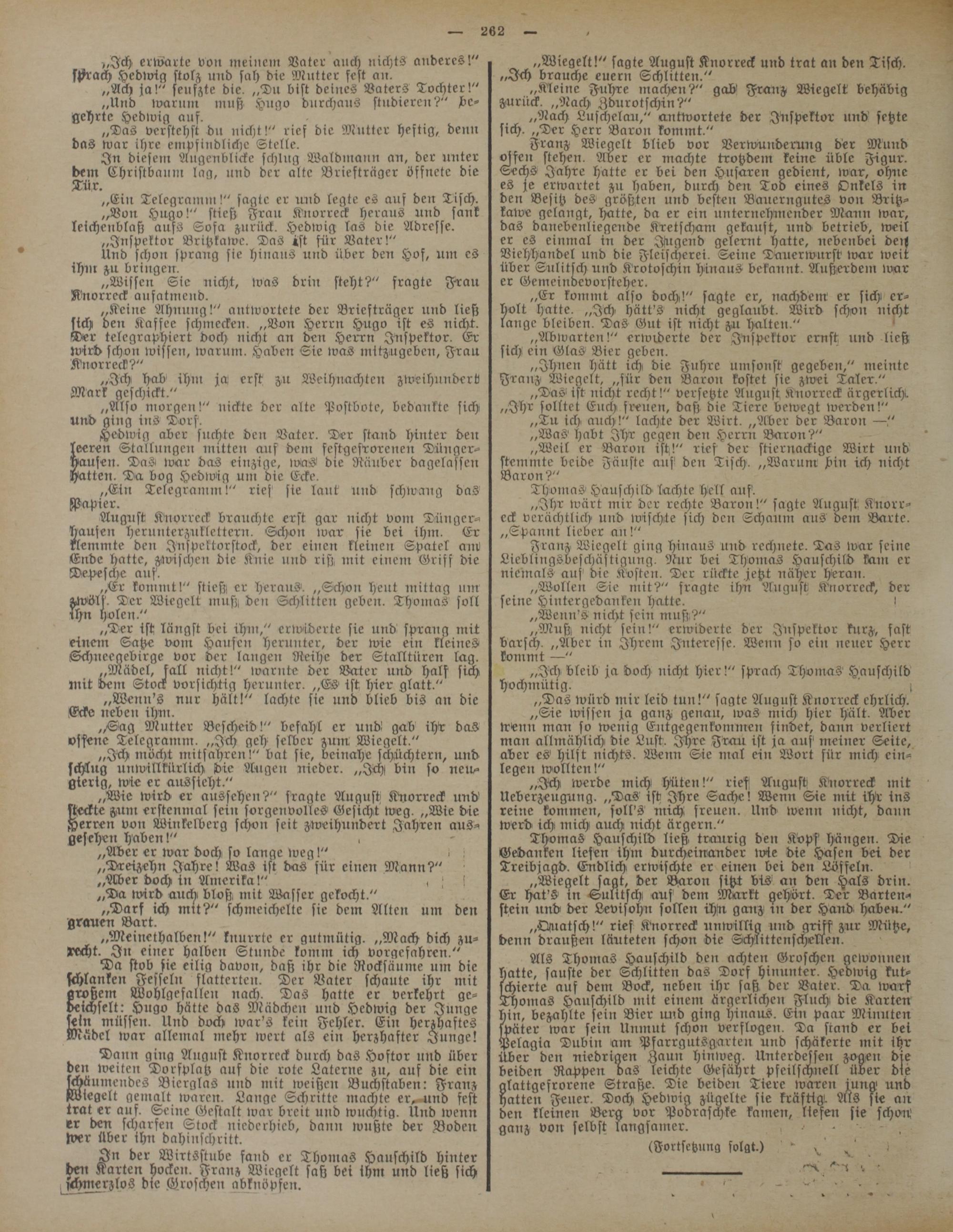 Als Thomas Hanschild den achten Groschen gewonnen hatte, sauste der Schlitten das Dorf hinunter. Hedwig kutschierte auf dem Bock, neben ihr saß der Vater. Da warf Thomas Hauschild mit einem ärgerlichen Fluch, die Karten hin, bezahlte sein Bier :u:d ging hinaus. Ein paar Minuten später war sein Unmut schon verflogen. Da stand er bet Pelagia Dubin am Pfarrgutsgarten und schäkerte mit ihr über den niedrigen Zaun hinweg. Unterdessen zogen die beiden Ruppen das leichte Gefährt pfeilschnell über die alattgesrorene Straße. Die beiden Tiere waren funa> und hatten Feuer. Doch Hedwig zügelte sie kräftig!. Als sie au den kleinen Berg vor Pooraschke kamen, Hefen sie schow ganz von selbst langsamer. - ,