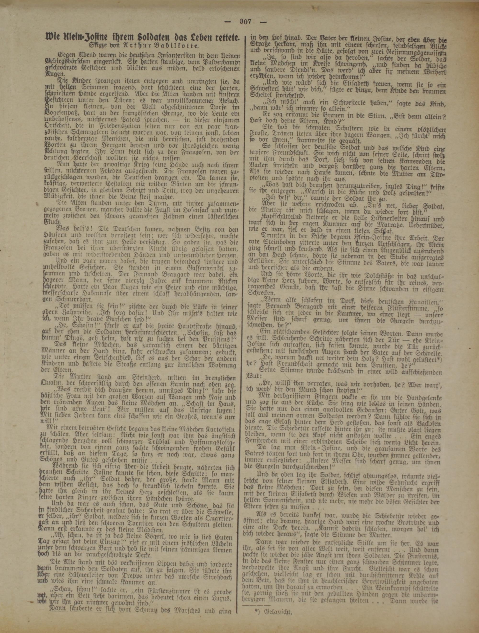 W kindlicher Sicherheit geahnt hatte: Da trat er über die Schnelle, er selber, „ihr Soldat, meldete sich in kurzen Worten als Quartieraast an und ließ den schlveren Tornister von den Schultern gleiten Dann erst erkannte er das kleine Mädchen.