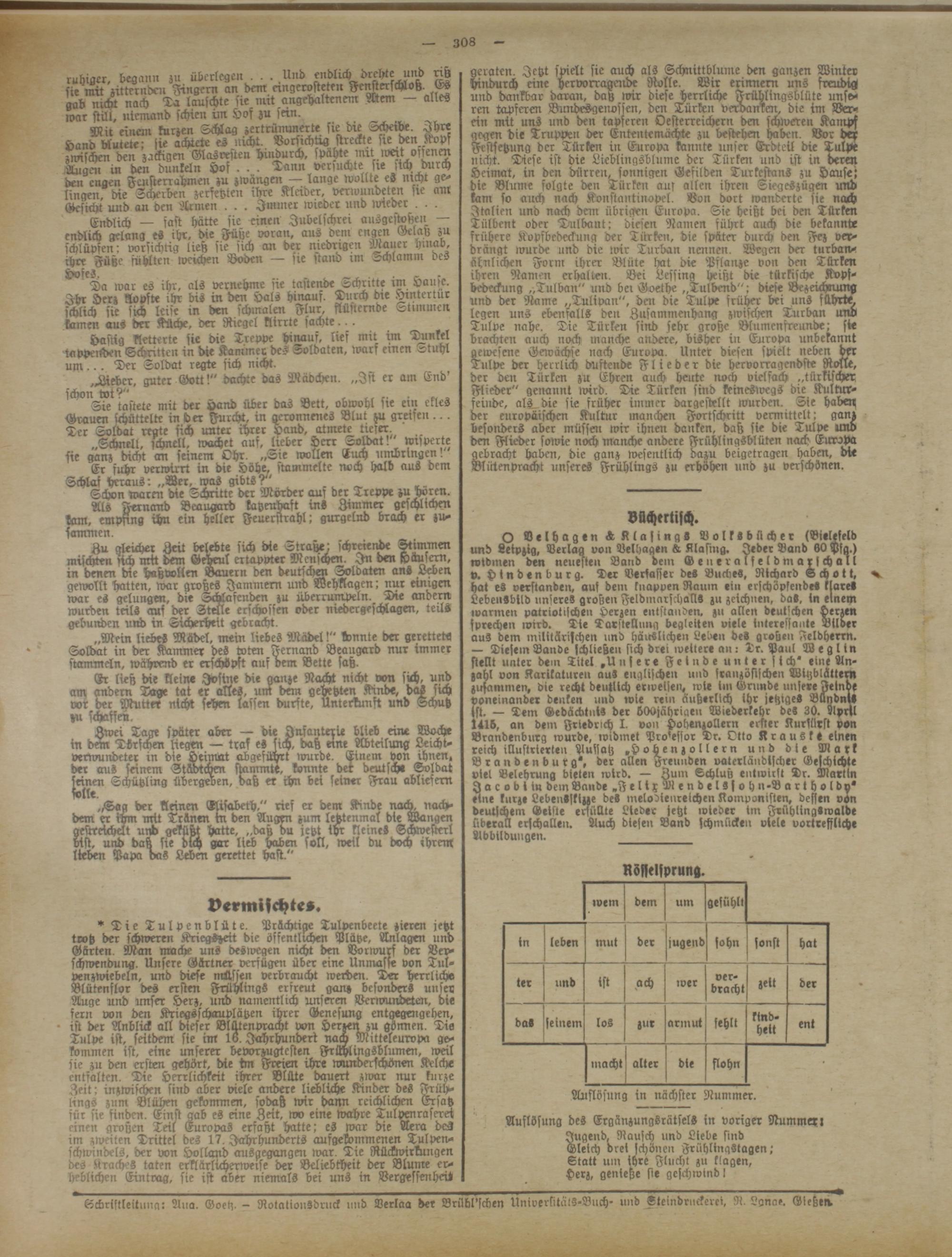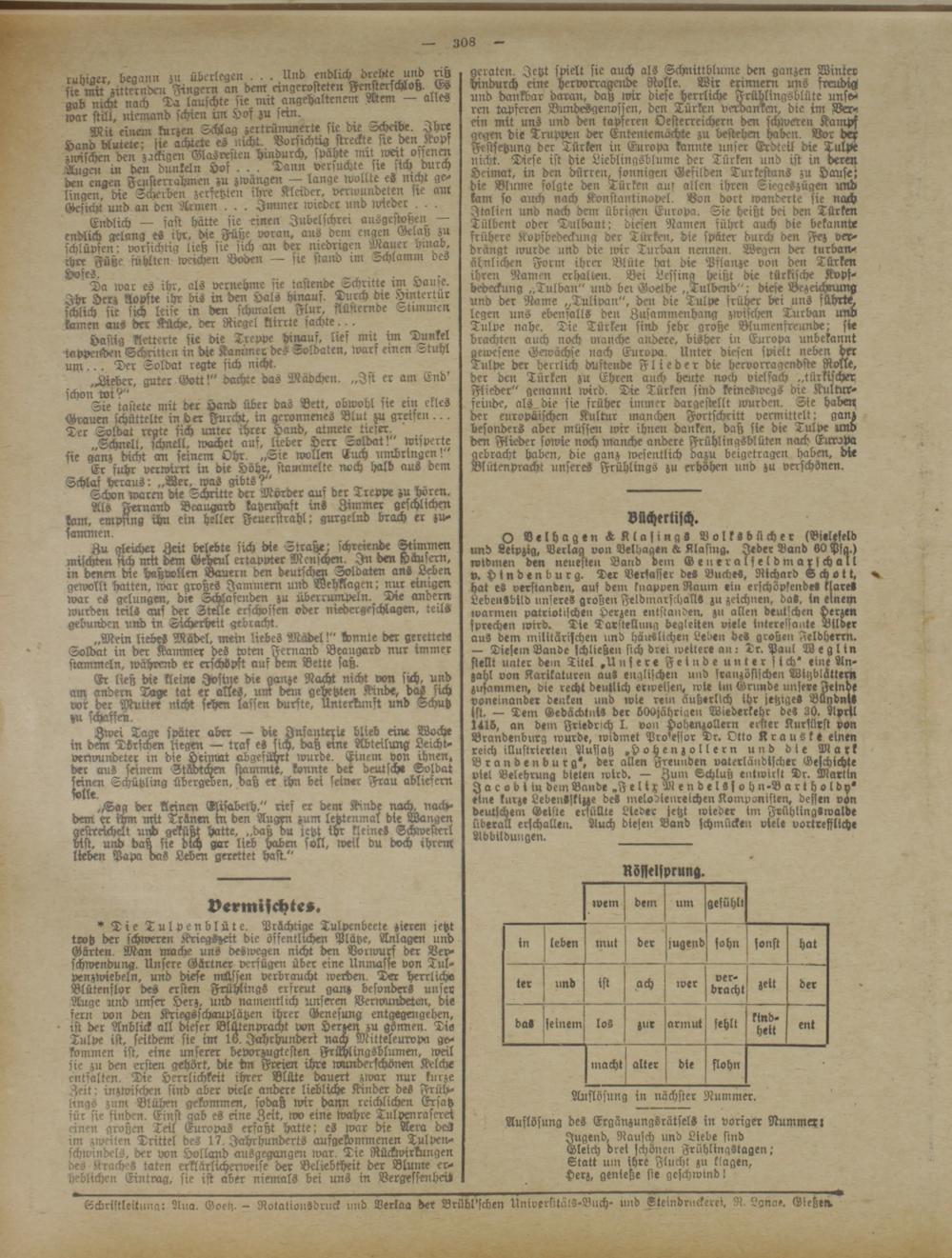 Auflösung des Ergänzungsrätsel- in voriger Nummexr Jugend. Rausch und Liebe sind Gleich drei schönen Frühlingstagen,'