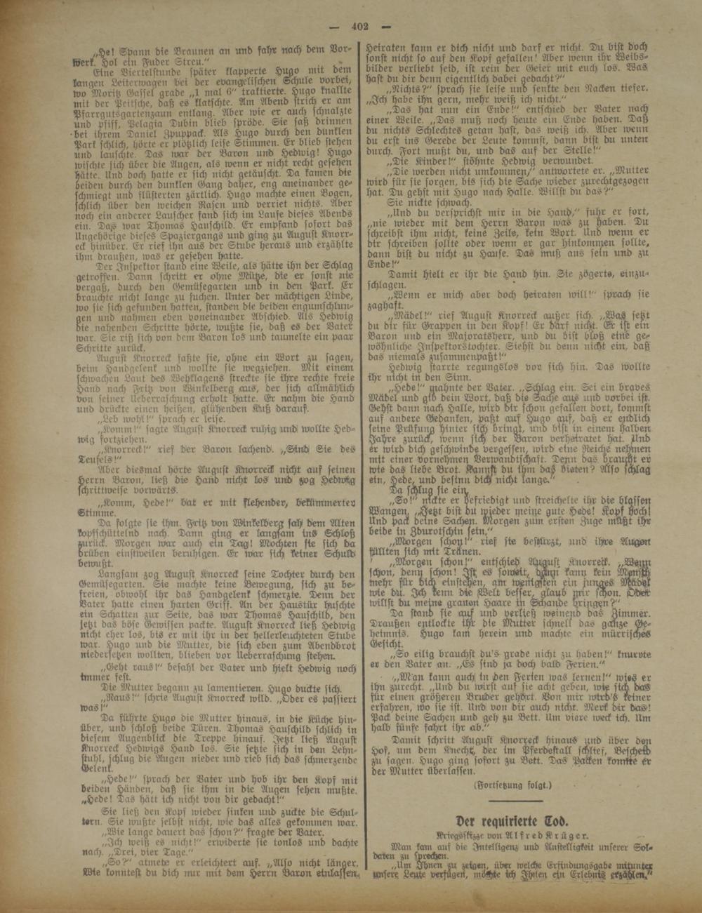 Langsam zog August Knorreck seine Tochter durch den Gemüsegarten. Sie nmchte keine Bewegung, sich zu befreien, obwohl ihr das Handgelenk schmerzte. Denn der Vater hatte einen harten Griff. An der Haustür huschte ein Schatten zur Seite, das war Thomas Hauschild, den jetzt das böse Gewissen packte. August Knorreck ließ Hedwig nicht eher los, bis er mit ihr in der hellerleuchteten Stube war. Hugo und die Mutter, die sich eben zum Abendbrot niedersetzen wollten, blieben vor ueberraschung stehen.