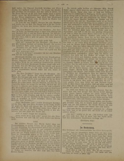 Fürchtegott Fritscher war grade bei der Krankenpflege, als der alte Abraham wieder zu ihm hereintrat. Die alte Mutter, abgezehrt und hustend, saß im Bett und schlürfte ein bißchen Milch, die die mitleidige Nachbarsfrau gebracht hatte. Eine Kuh hatte Fürchtegott Fritscher längst nicht mehr im Stalle. Der alte Abraham nahm ihn beiseite und sprach freundlich auf ihn ein, er sah nicht, welche Wut heimlich in dem unglücklichen Bauern kochte auf alle, denen es besser ging.