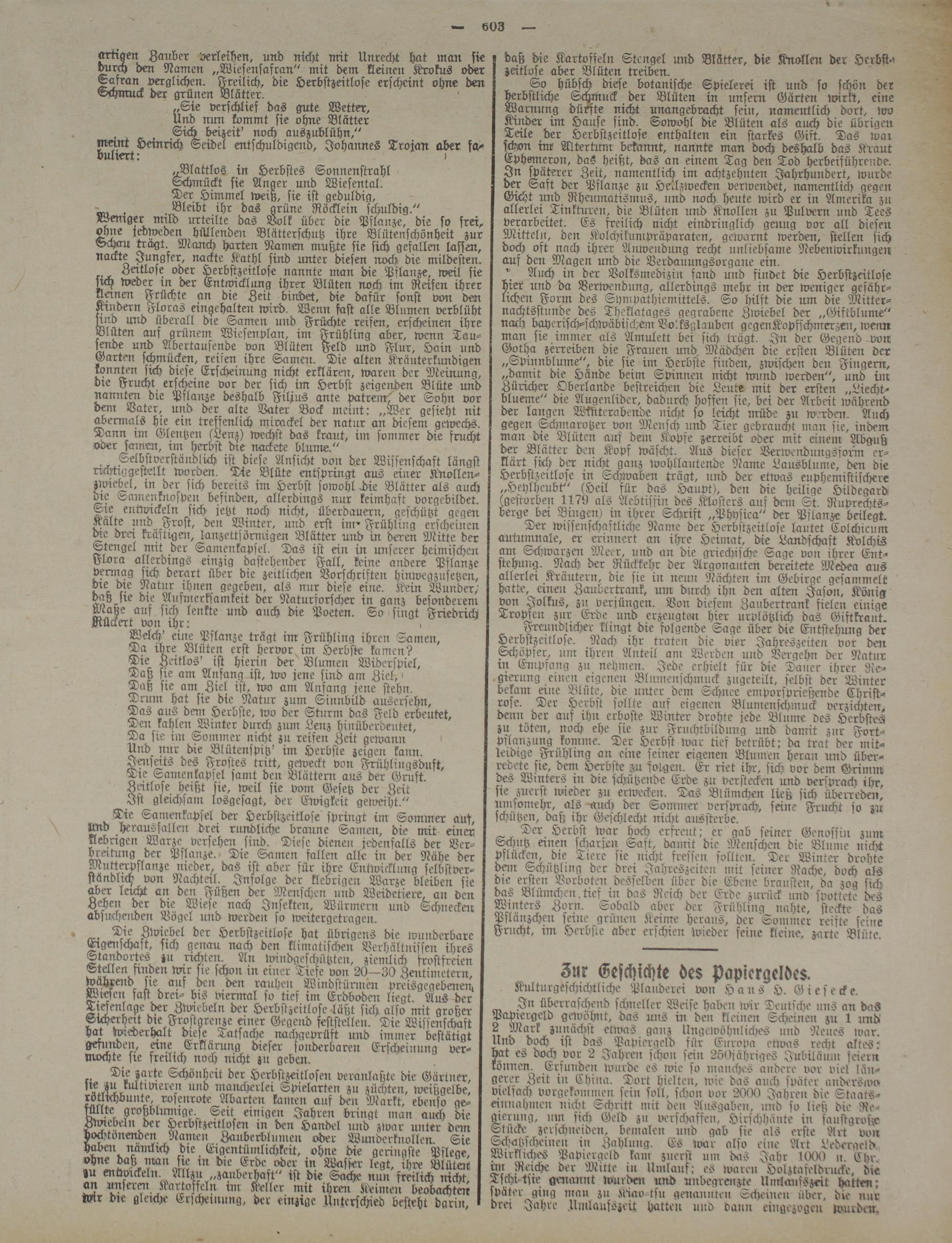 herbstliche Schmuck der Blüten in unfern Gärten unrkt, eine Warnung dürfte nicht unangebracht sein, namentlich dort, wo Kruder im Hause sind. Sowohl die Blüten als auch die übrigen Teile der Herbstzeitlose enthalten ein starkes Gift. Das war schon im Altertum bekannt, nannte man dock) deshalb das Kraut Ephemeron, das heißt, das an einem Tag den Tod herbeiführende. In späterer Zeit, namentlich im achtzehnten Jahrhundert, wurde der Saft der Pflanze zu Heilzwecken verwendet, namentlich gegen Gicht und Rheumatismus, und noch heute wird er in Amerika zu allerlei Tinkturen, die Blüten urid Knollen zu Pulvern und Tees verarbeitet. Es freilich nicht eindringlich geling vor all diesen