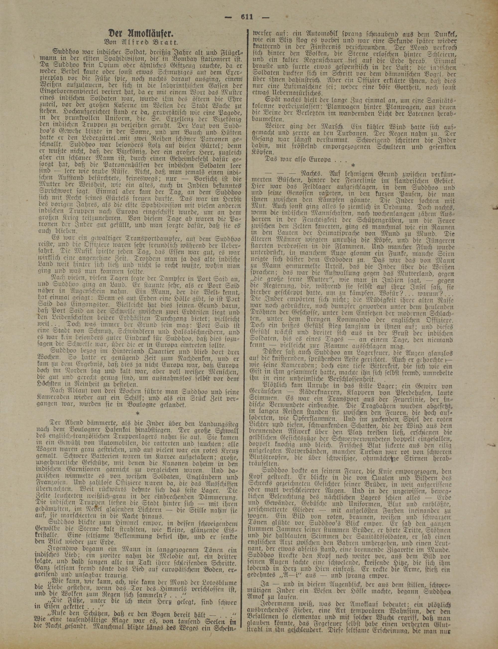Suddhoo war indischer Soldat, dreißig "Jahre alt und Flügelmann in der elften Spahidivision, die in Bombay stationiert ist. Da Suddhoo kein Opium oder ähnliches Giftzeug rauchte, da er weder Bethel kaute oder sonst etwas Schmutziges ans dem Exer- ^ierplatz vor die Füße spie, noch nachts darauf ausging, einem' Weißen anszulauern, der sich in die labyrinthischen Gassen der Emgeborenenviertel verirrt hat, da er mit einem Wort das Muster eines indischere Soldaten war, wurde ihm des Aftern die Ehre zuteil, vor der großer: Kaserne im Westen der Stadt Wache zu stehen. Hochaufgerichtet stand er da, gravctätisch wie eine Pagode, in der prunkvollen Uniform, die Se. Erzellenz- der Bizekönig' den indischen Truppen zu verleihen geruht. Der Laus von Suddhoo s Gewehr blitzte in der Sonne, und um Bauch und Hüften hatte er den Ledergürtel.mit -zwei Reihen schöner Patronen geschnallt. Suddhoo war besonders stolz auf diesen Gürtel: denn er wußte nicht, daß der Vizekonig, der ein großer .Herr, zugleich aber ein schlauer Mann ist, durch einen Geheimbefehl dafür gesorgt hat, daß die Patronenhülsen der indischen Soldaten leer sind — leer wie taube Nüsse. Nicht, daß Man jemals einen indi- ichen Aufstand befürchtete, keineswegs; nur — Vorsicht ist die Mutter der Weisheit, wie ein altes, auch in Indien bekanntes Sprichwort sagt. Einmal aber kam der Tag, an dem Suddhoo sich mit Recht seines Gürtels freuen durfte. Das war im Herbst des vorigen Jahres, als die elfte Spa hidi Vision mit vielen anderen indischen Truppen iiach Europa eingeschifft wurde, um an dem großen Krieg teilzunehmen. Von diesem Tage ab waren die Patronen der Inder gut gefüllt, und nlan sorgte dafür, daß sie es auch blieben.