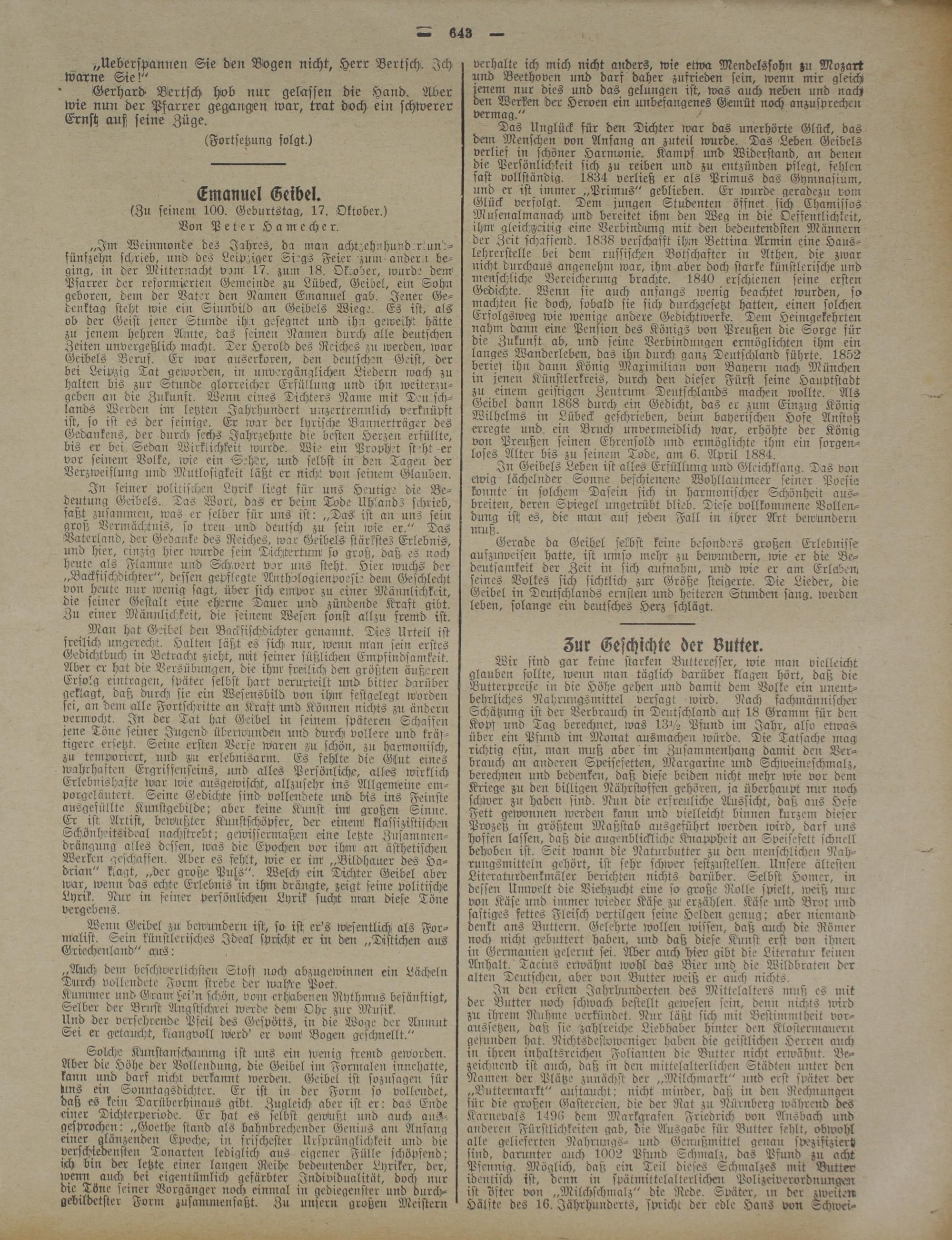 In Geibels Leben ist alles Ersülümg und Gleichklang. Das von ewig lächelnder Sonne beschienene Wohllautmeer seiner Poesie konnte in solchem Dasein sich in harnionischer Schönheit aus- breiten, deren Spiegel ungetrübt blieb. Diese vollkommene Vollendung ist es, die man aus jeden Fall in ihrer Art bewundern muß.