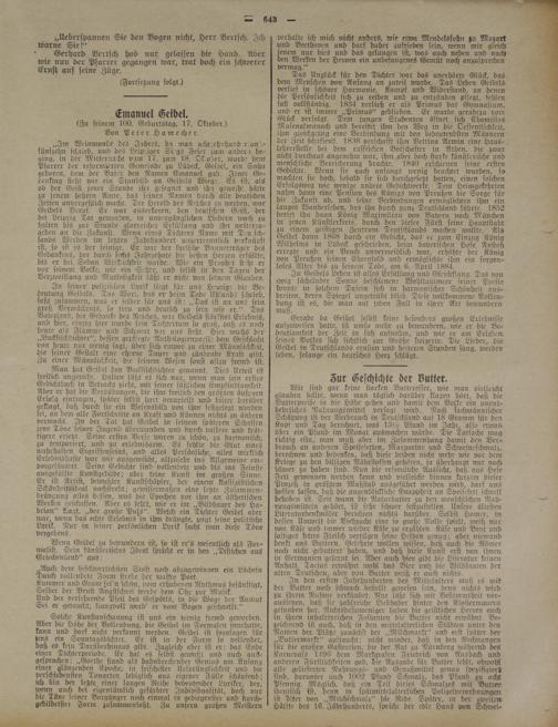 Gerade da Geißel selbst keine besonders großen Erlebnisse ausznweisen hatte, ist umso mehr zu bewundern, wie er die Bedeutsamkeit der Zeit in sich aufnahm, und wie er an: Erlaben seines Volkes sich sichtlich zur Größe steigerte. Die Lieder, die Geibel in Deutschlands ernsten und heiteren Stunden sang, werden leben, solange ein deutsches Herz schlägt.