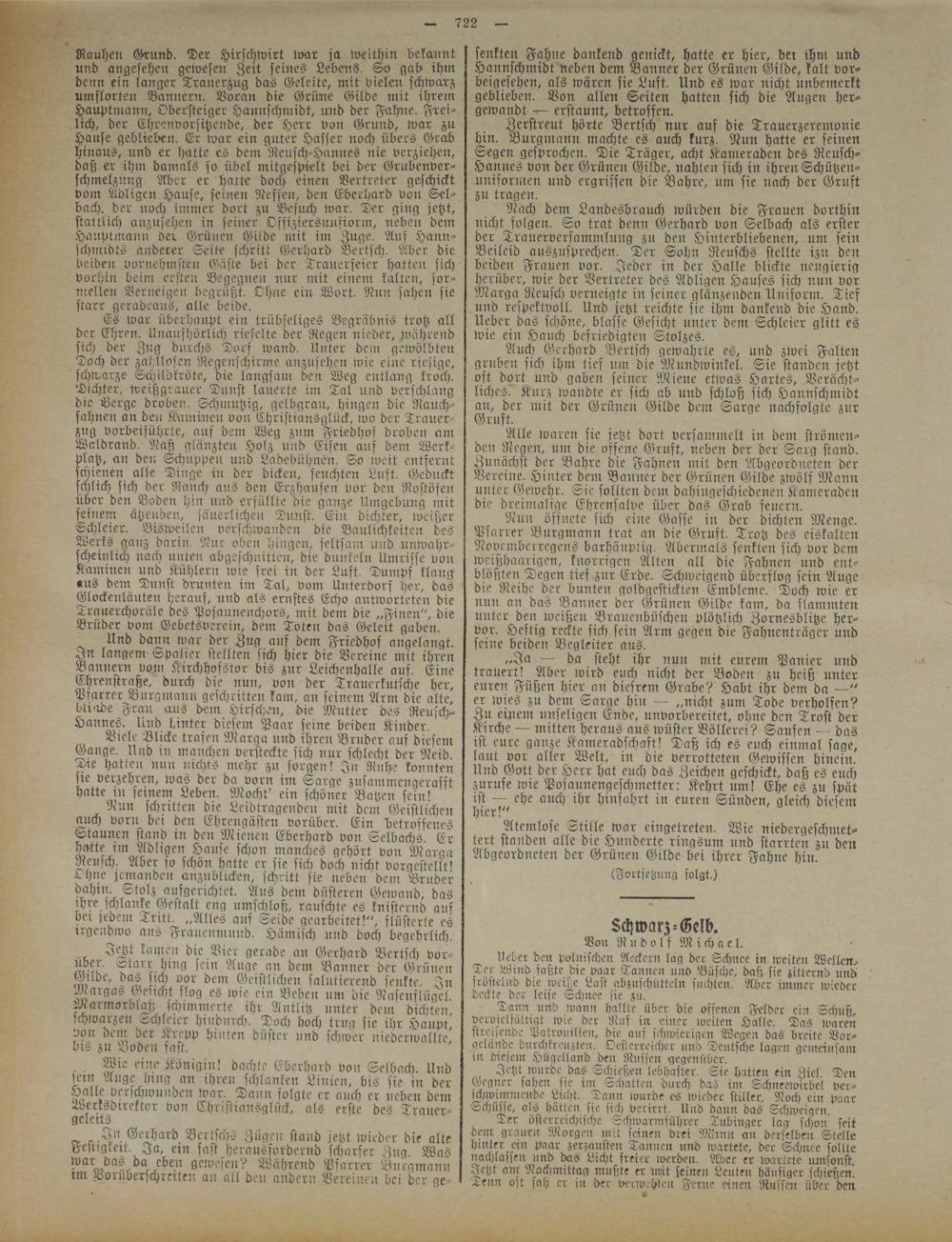 Jetzt kamen die Vier gerade an Gerhard Bertsch vor- Starr hing sein Auge au dem Banner der Grünen Gilde, das ich vor dem Geistlichen salutierend senkte. In Margas GeUcht flog es wie ein Beben um die Nasenflügel Marmorblaß schimmerte ihr Antlitz unter dem dichten, schwarzen Schleier hindurch. Doch hoch trug sie ihr Haupt, von dem der Krepp hinten düster und schwer niederwallte, bis zu Boden fast.