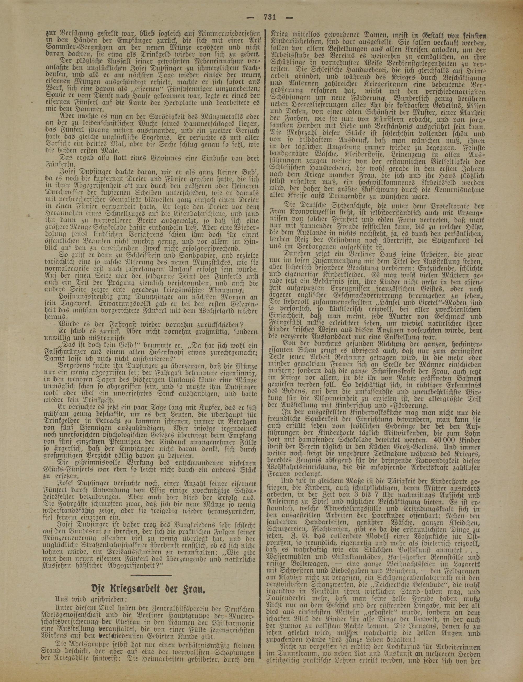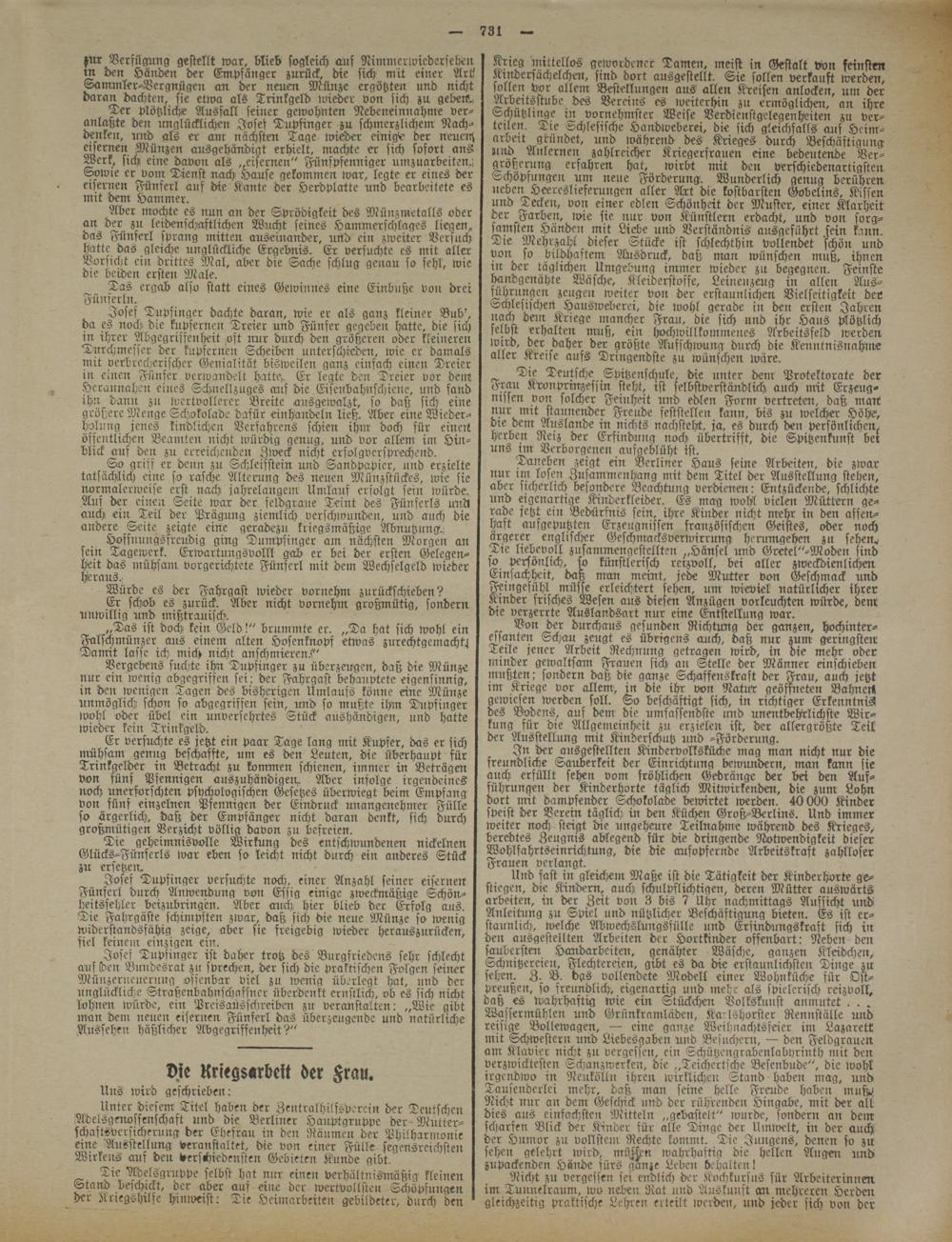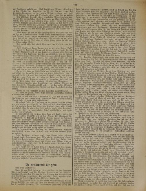 In der ausgestellten Kindervolksküche mag man nicht nur die freundliche Sauberkeit der Einrichtung bewundern, man kann sie auch erfüllt sehen vom fröhlichen Gedränge der bei den Aufführungen der Kinderhorte täglich Mitwirkenden, die zum Lohn dort mit dampfender Schokolade bewirtet werden. 40000 Zkinder speist der Verein täglich in den Küchen Groß-Berlins. Und immer weiter noch steigt die ungeheure Teilnahme während des Krieges/ beredtes Zeugnis ablegend für die dringende Notwendigkeit dieser Wohlfahrtseinrichtung, die die aufopfernde Arbeitskraft zahlloser Frauen verlangt.