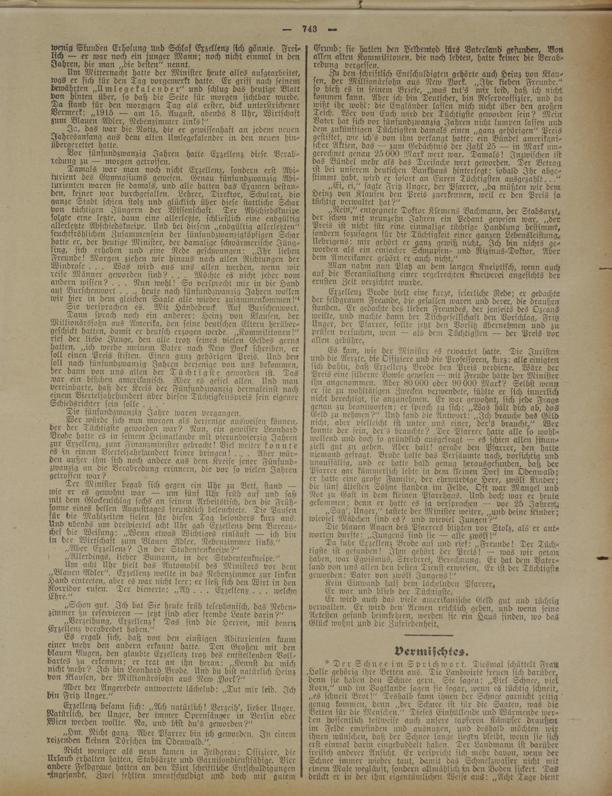 Es kam, wie der Minister es erwartet hatte. Die Juristen urw die Aerzte, die Offiziere und die Professoren, kurz: alle einigten sich idahin, daß Exzellenz Brode den Preis verdiene. Wäre der Preis «eine silberne Bowle gewesen — mit Freude hätte der Minister ihn angenommen. Aber 80 000 oder 90 000 Mark? Selbst wenn er sie zu wohltätigen Zwecken verwendete, fühlte er sich innerlich nicht berechtigt, sie anzunehmen. Er war gewohnt, sich jede Frage genau zu beantworten; er sprach zu sich: „Was hält dich ab, das Geld zu nehmen?" Und fand die Antwort: „Ich brauche das Geld nicht, aber vielleicht ist unter, uns einer, der's braucht." Wer konnte der sein, der's brauchte? .Der Pfarrer hotte alle so woljU wollend und doch so gründlich ausgefragt — eS "schien allen finanziell gut zu gehen. Aber halt! gerade den Pfarrer, den hatte Niemand gefragt. Brode holte das Versäumte nach, vorsichtig und unauffällig, und er hatte bald genug herausgefunden, daß der Pfarrer gar kümmerlich lebte in dem kleinen Dorf im Odenwald; er hatte eine große Familie, der ehrwürdige Herr, zwölf Kinder; die fünf ältesten Söhne standen im Felde. Ost war Mangel und Not zu Gast in dem kleineii Pfarrhaus. Und doch war er heute! gekommen; denn er hatte es ja versprochen — vor 25 Jahren^