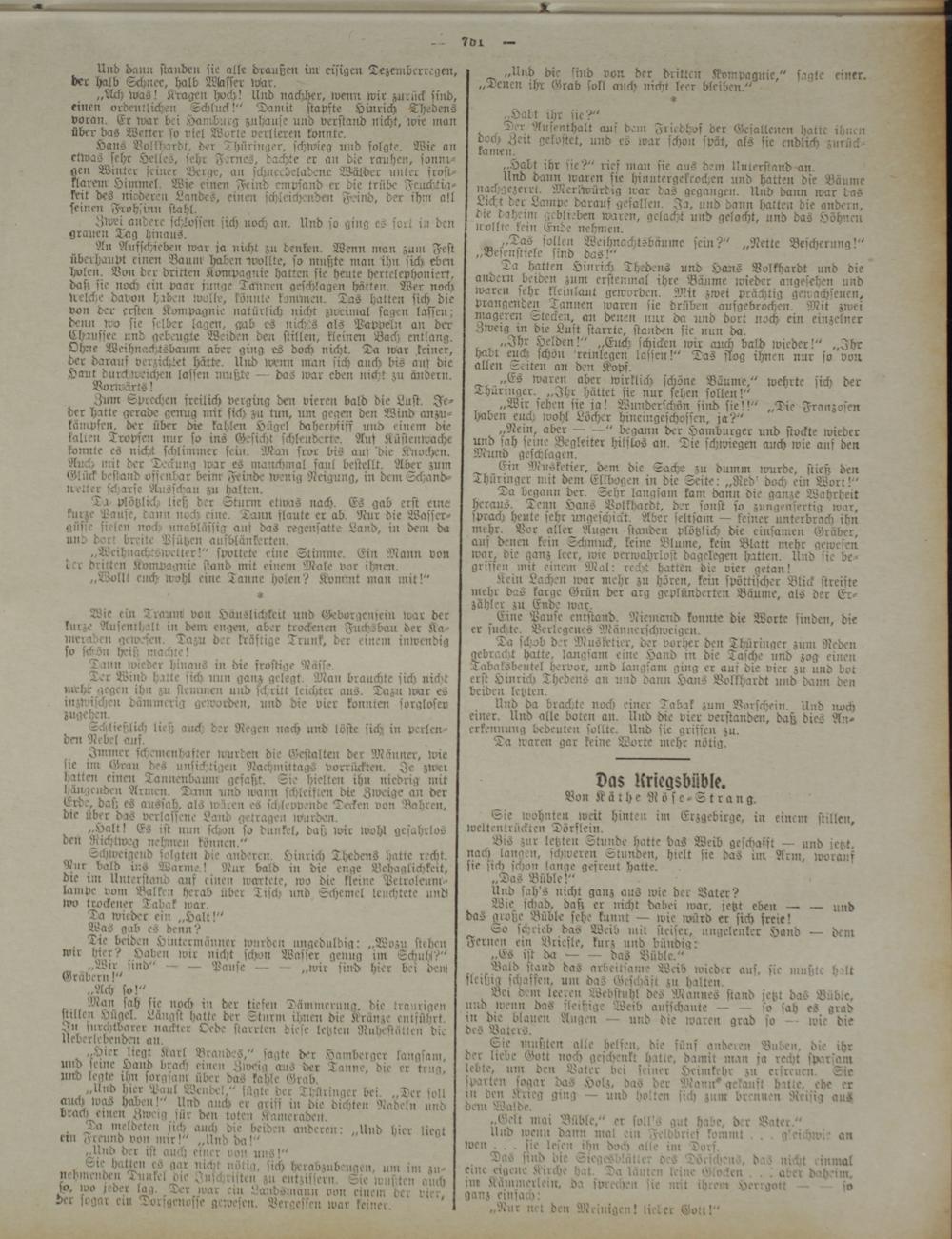 Sie mußten alle helfen, die fünf anderen Buben, die ihr der liebe Gott noch geschenkt hatte, damit man ja recht sparsam cbte, um den Vater bei seiner Heimkehr zu erfreuen. Sie Parten sogar das Holz, das der Warnt* gekauft bitte, ehe er iu den Krieg ging — und holten sich znm brennen Reisig aus min Walde.