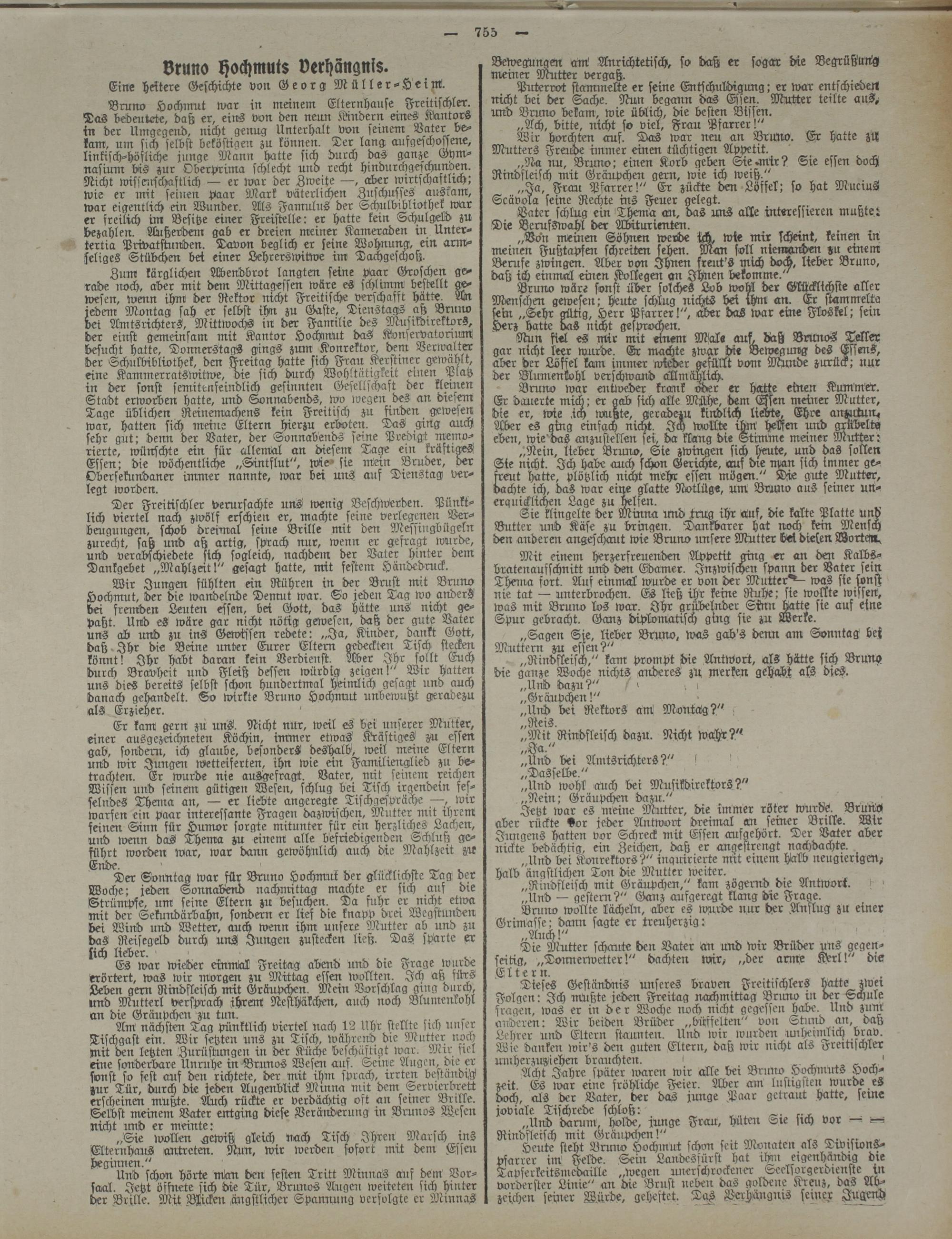 Am nächsten Tag pünktlich viertel nach 12 Uhr stellte sich unser Tischgast ein. Wir setzten uns zu Tisch, während die Mutter noch mit den letzten Zurüstungen in der Kirche besch-üstich war. Mir fiel eine sonderbare Unruhe in Brunos Wesen auf. Seme Augen, die er sonst so fest auf den richtete, der mit ihm sprach, irrten beständig zur Tür, durch die jeden Augenblick Mruna nitt dem Servierbrett erscheinen mutzte. Auch rückte er verdächttg oft an seiner Brille. Selbst meinem Vater entchng diese Veränderung in Brunos Wesen nicht und er meinte: ^ ,