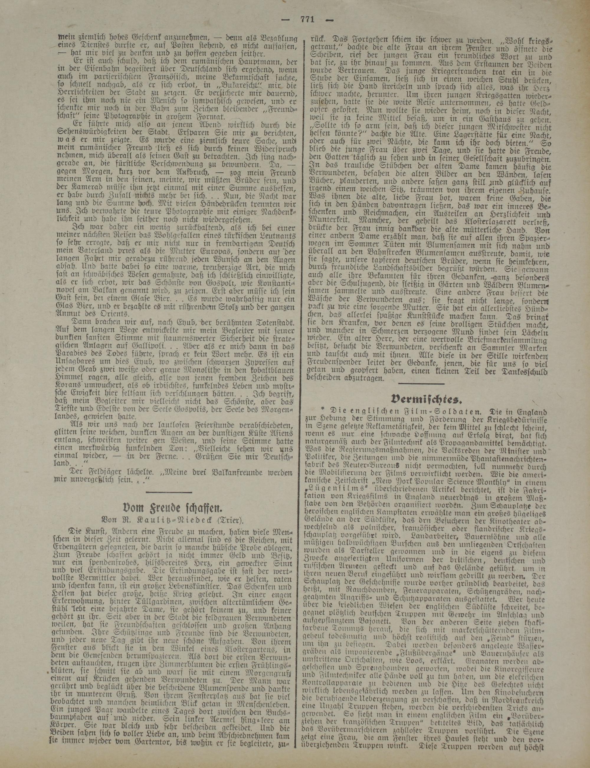 Er ist <ruch schuld, daß ich dem rumänischen Hauptmann, der in der Eisenbahn begeistert über Deutschland sich ergehend, wenn mich im Pariserischsten Französisch, meine Bekanntschaft suchte, so schnell nachgab, als er sich erbot, in „Bukareschit-" mir die Herrlichkeiten der Stadt ziu zeigen. Er versicherte mir dauernd, es sei ihm noch nie ein Mensch so sympathisch gewesen, und ec schenkte mir noch in der Bahn zum Zeichen bleibender „Freund« schaft" seine Photographie in großem Format.