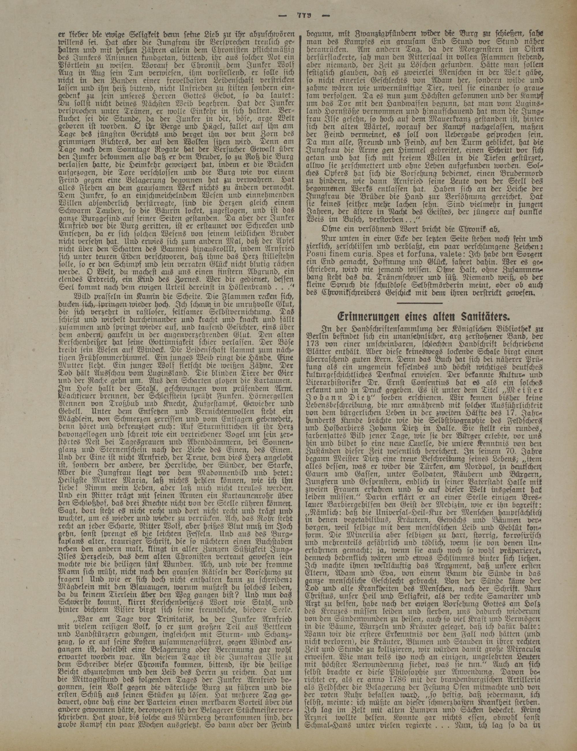 In der Handschriftensammlung der Königlichen Bibliothek zu Berlm befindet sich ein unansehnlicher, arg zerstoßener Band, dev 173 von einer unscheinbare::, schlechten Handschrift beschriebene; Blätter enthält. Aber diese keineswegs lockende Schale birgt euren Überraschend guten Kern. Denn das Buch hat sich bei näherer Prüfung als ein ungemein fesselndes und höchst wichtiges deutsches kulturgeschichtliches Denkmal erwiesen. Der bekannte Kultur- und Literarhistoriker Dr. Ernst Consenti:rs hat es als ein solches erkannt und in Druck gegeben. Es ist unter dem Titel „M e t ft e r