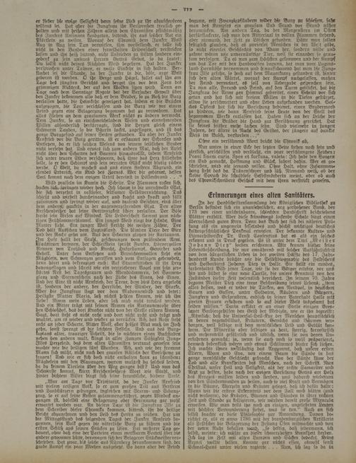 § ohann Dietz" soeben erschienen. Wir kennen bisher keine ebensbeschreibung, die nur annährend mit solcher Ausführlichkeit von dem bürgerliche:: Leben in der zweiten Hälfte des 17. Jahrhunderts Kunde brächte wie die Selbstbiographie des Feldschers? und Hosbarbiers Johann Dietz nt Halle. Sie stellt ein rundes^ farbensattes Bftd jener Tage, wie sie der Bürger erlebte, vor uns hin und bftdet so eine neue Quelle, die unsere Kenntnis von den Zuständen dieser Zeit lvesentlich bereichert. Ir: seinem 70. Jahre begann Meister Dietz eine treue Beschreibung seines Lebens- „item alles dessen, was er wider die Türken, am Nordpol, in deutschen! Gauen und Gassen, rurter Soldaten, Räubern und Bürgern, Jungfern und Gespenstern, endlich in seiner Vaterstadt Halle mit zweien Frauen erfahre:: und so auf dieser Welt insgesamt hat' leiden müssen." Darin erklärt er an einer Stelle einige:: Breslauer Barbiergehilfen den Geist der Medizin, wie er chn begreift: ,,Nämlich: daß die Unive^al-Heil-Kur der Menschen hauptsächlich :n denen vegetabilibus, Kräutern, Gewächs und Baume:: verborgen, weil selbige mit dem menschlichen Leib und Geblüt ko:r- form. Die Minerftia aber selbigen zu hart, storrig, korrvsirisch und mehrentefts gefährlich und tödlich, wenn sie von denen U:v- erfahrnen gemacht; ja, wenn sie auch :wch so wohl präparieret^ dennoch bedenklich wäre:: und etwas Schlimmes hinter sich ließen. Ich machte ihnen :oe:tlLuftig das Argument, daß unsere eichen Elten:, Adam und 'Eva, von einem Baum die Siftwe in das ganze menschliche Geschlecht gebracht. Von der Sünde ftime der Tod und alle Krankheiten des Menschen, nach der Schrift. Nun Christus, unser Heft imb Seligkeit, als der rechte Samariter und Arzt zu helfen, habe nach der einigen Vorsehung Gottes am Holz des Kreuzes müssen leiden und sterben, uns dadurch wiedeimnt von den Sündenwunden zu beften, auch so viel Kraft und Vermögen in die Bäume, Wurzeln und Kräuter geleget, daß ich daftir halte: Wann wir die ersteve Erkenntnis vor dem Fall noch hätten (und nicht verloren), die Kräuter, Blunren mrd Stauden in ihrer rechten Zeit und Stunde zu kollizieren, wir würden damit große Miracula erweisen. Wie man teils itzo noch an einigen, ungelehrten Leuten mit höchster Verwunderung siehet, was sie tun." Auch an sich selbst brachte er diese Philosophie z:rr Ä:rwendung. Davon berichtet er, als er anno 1786 mit der bra:ft>enb:rrgischen Artillerie; als Feldscher die Belagerung der Festung Ofen mittnachte und von der roten Ruhr befallen toard, „so heftig, daß jedermann, lich selbst, meinte: ich müßte an dieftr schmerzhaften Krankheit sterben. Ich lag im Zelt mit alten Lumpen und Säcken bedecket. Keins Arznei joollte helfe::. Konnte gar nichts esse::, obwohl sonst Schmal-Hans unter vielen regierte . . . Nun, ich lag so da in