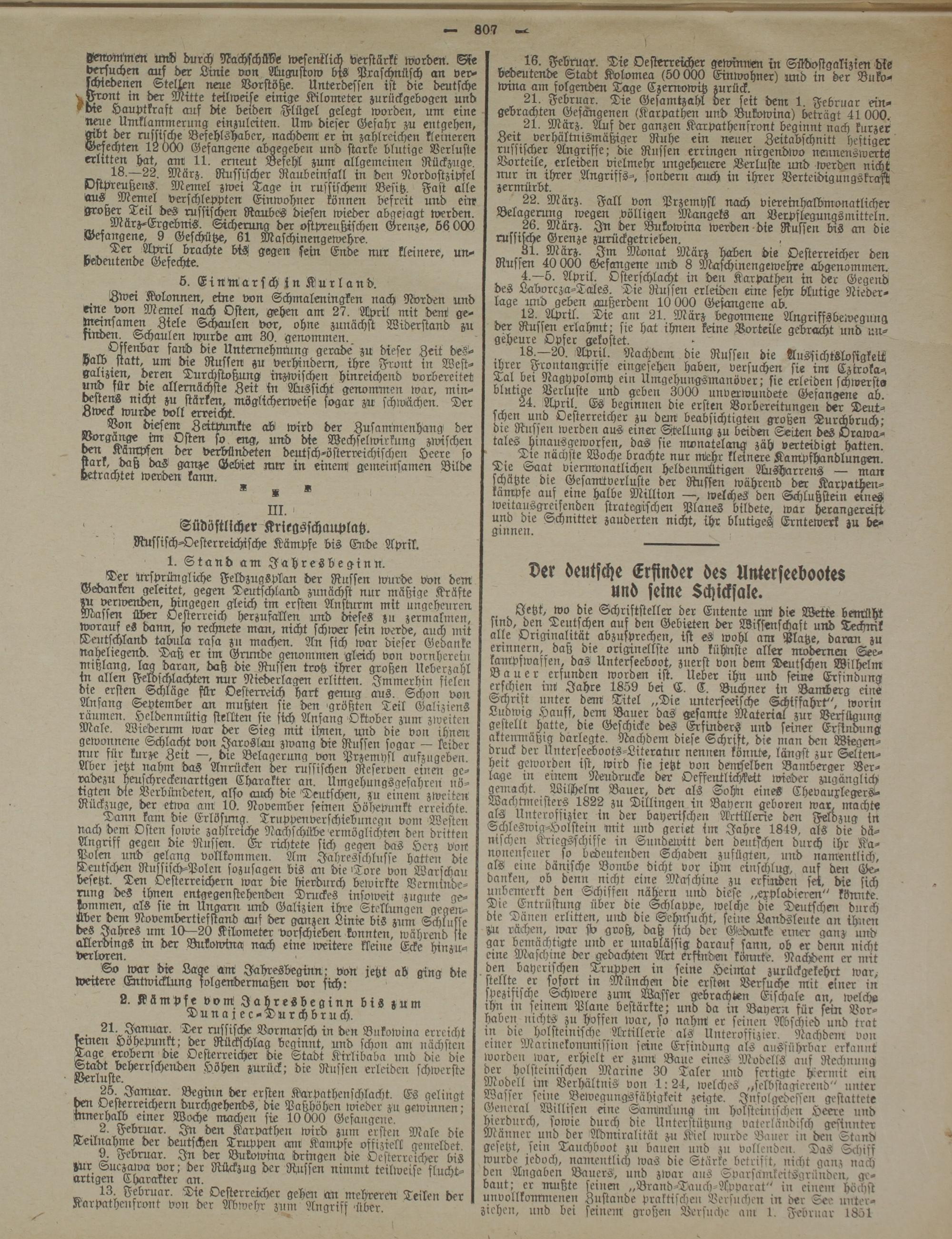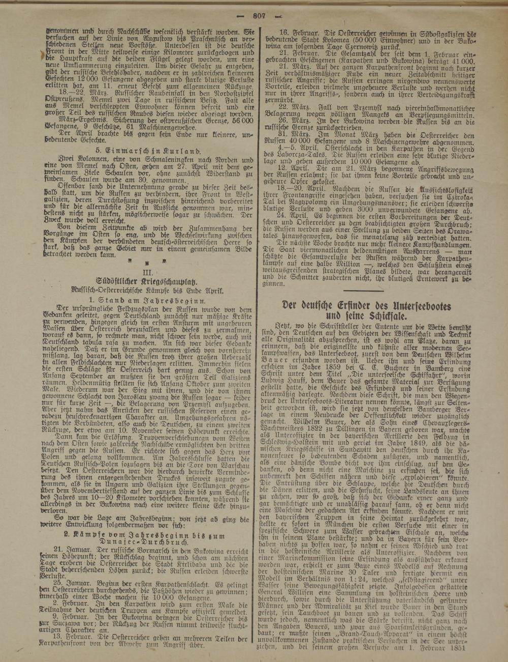 4.-5. April. Osterschlacht in deir Karpathen in der Gegend des Laborcza-Tales. Die Russen erleiden eine sehr blutige Niederlage und geben außerdem 10 000 Gefangene ab.