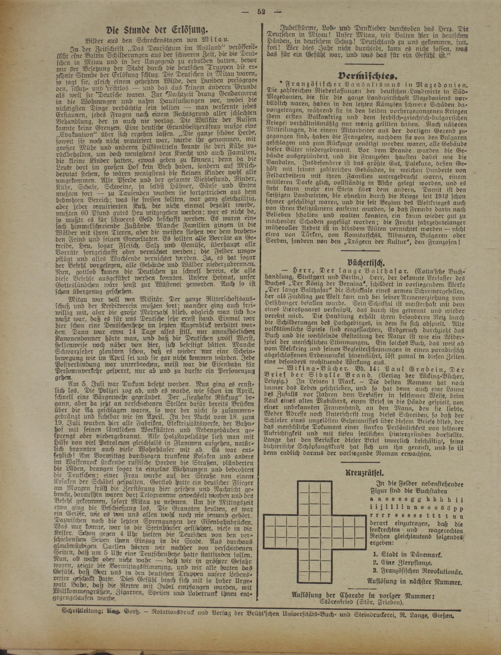 Jübelstürme, Lob- und Danklieder durchtoben das Herz. Dis Deutschen in Mitau! Unser Mitau, wir Balten hier in deutschen D ätzden, in deutschem Schutz! Deutschland zu uns gekommen, frei, frei! Wer dies Jahr nicht durchlebt, kann es nicht fassen, was das für ein Gefühl war, und was das für ein Gefühl ist."