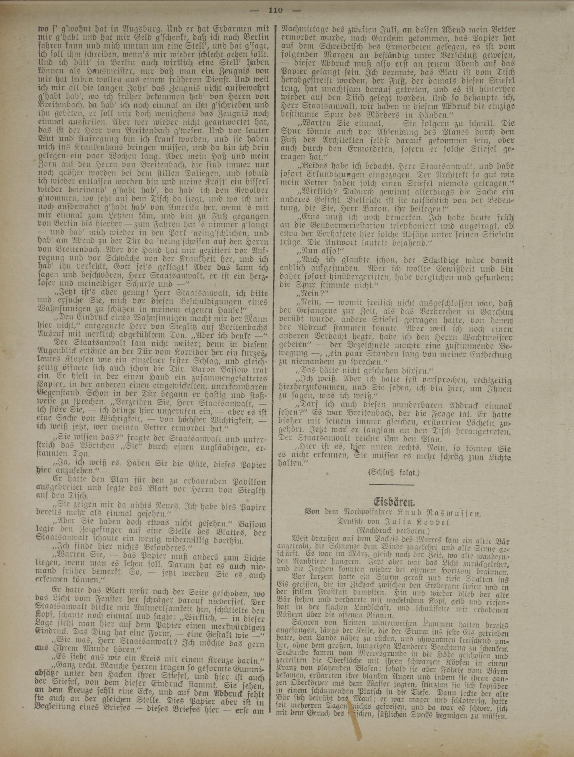 „Auch ich glaubte schon, der Schuldige wäre damit endlich aufgefunden. Aber ich wollte Gewißheit und bin daher sofort hinübergeritten, habe verglichen und gefunden: die Spur stimmte nicht."