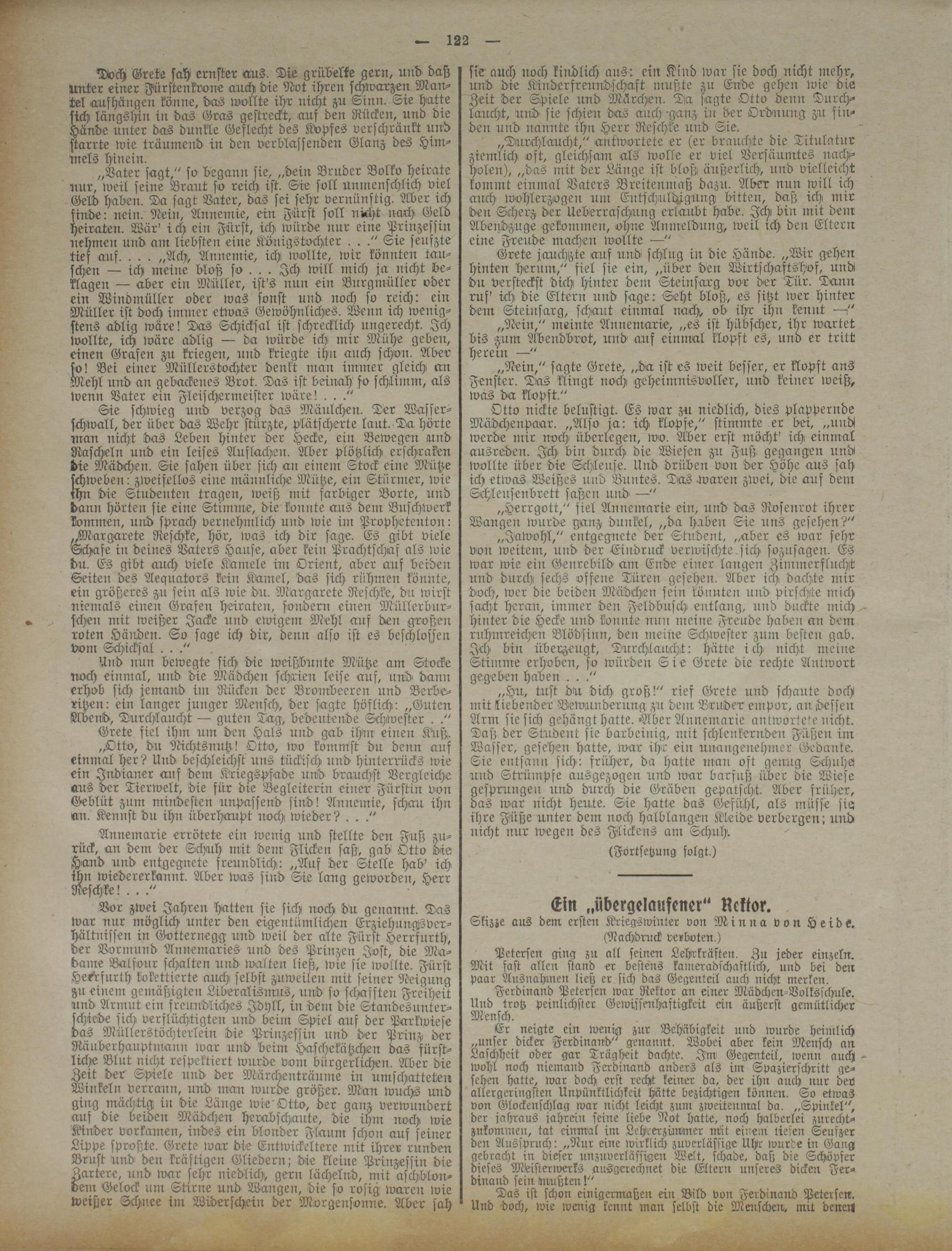 Vor zwei Jahren hatten sie sich :roch du genannt. Das war nur möglich unter den eigentümlichen Erzieh uuAsver- hältnissen in Gotternegg und weil der alte Fürst Herrsurth, der Vormund Annemaries und des Prinzen Jost, die Madame Balsour schalten und walten ließ, wie sie wollte. Fürst Hemfurth kokettierte auch selbst zuweilen mit seiner Neigung zu einem gemäßigten Liberalismus, und so schafften Freiheit und Armut ein freundliches Idyll, in dem die Standesunterschiede sich verflüchtigten und beim Spiel auf der Parkwiese das Müllerstöchterlein die Prinzessin und der Prinz, der Räuberhauptmam: war und beim Haschekützchen das fürstliche Blut nicht respektiert wurde vom bürgerlichen. Aber die Zeit der Spiele und der Märchenträume in umschatteten Winkeln verrann, u:ü> man wurde größer. Man wuchs und giirg mächtia in die Länge wie'Otto, der ganz verwundert auf die Leiden Mädchen herabschaute, die ihm noch wie Kinder vorkamen, indes ein blonder Flaum schon auf seiner Lippe sproßte. Grete war die Entwickeltere mit ihrer runden Brust und den kräftigen Gliedern; die kleine Prinzessin die Zartere, und war sehr niedlich gern lächelnd, mit aschblon- vem Gelock um Strrne und Wangen, die so rosig tvaren wie weißer Schnee im Widerschein der Morgensonne. Aber sah