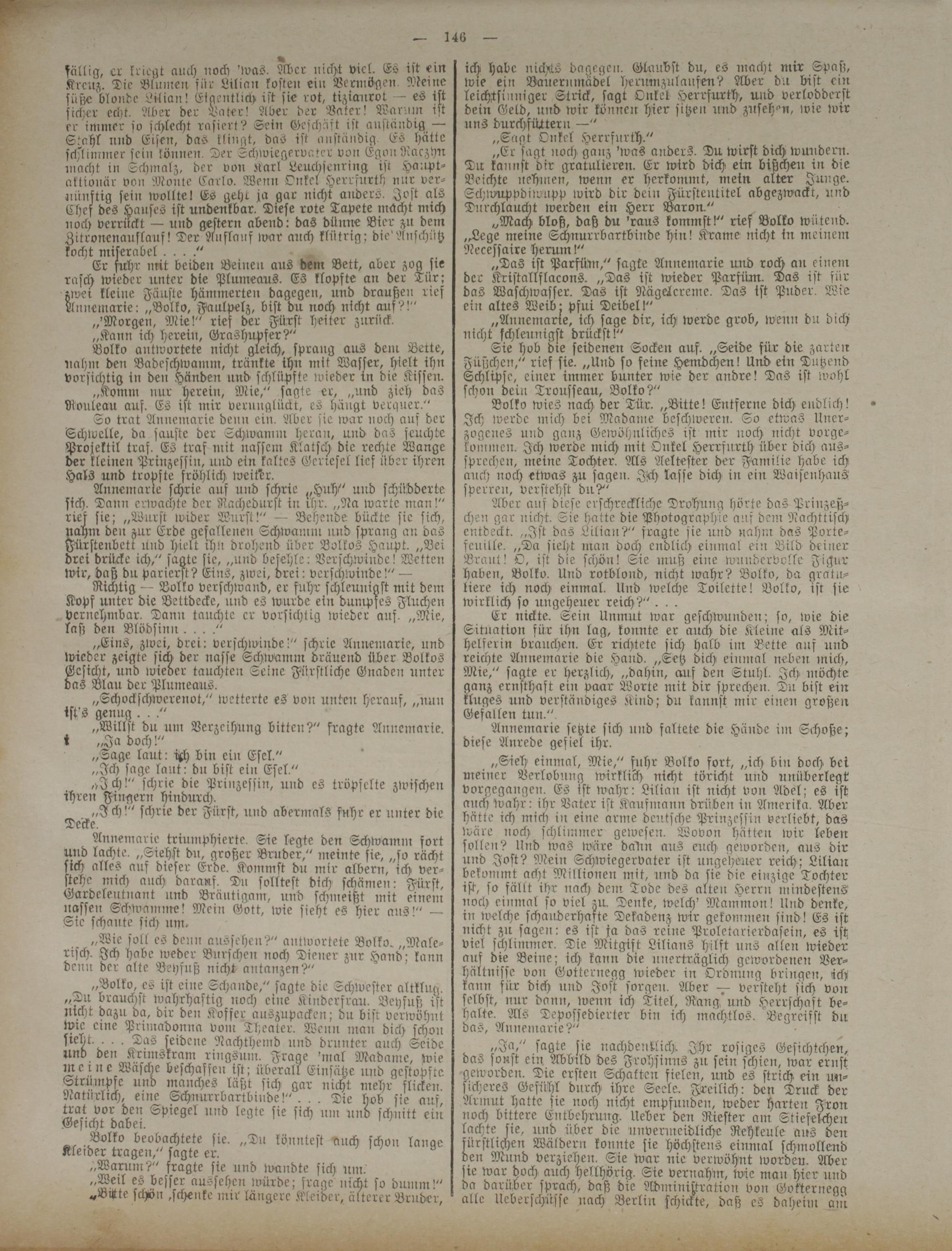 „Sieh einmal, Mie," fuhr Bolko fort, „ich bin doch bei meiner Verlobung wirklich nicht töricht und unüberlegt vorgegangen. Es ist wahr: Lilian ist nicht von Adel; es ist attch wahr: ihr Vater ist Kaufmann drüben in Amerika. Aber hätte ich mick) in eine arme deutsche Prinzessin verliebt, das wäre noch schlimmer gewesen. Wovon hätten wir leben sollen? Und was wäre daün aus eud) geworden, aus dir und Jost? Mein Schwiegervater ist ungeheuer reich; Lilian bekommt acht Millionen mit, und da sie die einzige Tochter ist, so fällt ihr nack) dem Tode des alten Herrn mindestens noch einmal so viel zu. Denke, welch' Mammon! Und denke, in welche schauderhafte Dekadenz wir gekommen sind! Es ist nicht zir sagen: es ist ja das reine Proletarierdasein, es ist viel schlimmer. Die Mitgift Lilians hilft uns allen wieder auf die Beine; ick) kann die unerträglich gewordenen Verhältnisse von Gotternegg wieder in Ordnung bringen, tid* kann für dich und Jost sorgen. Aber — versteht sich von selbst, nur dann, wenn ich Titel, Rang, und Herrschaft behalte. Ms Tepossedierter bin ick) machtlos. Begreifst du das, Annemarie?"