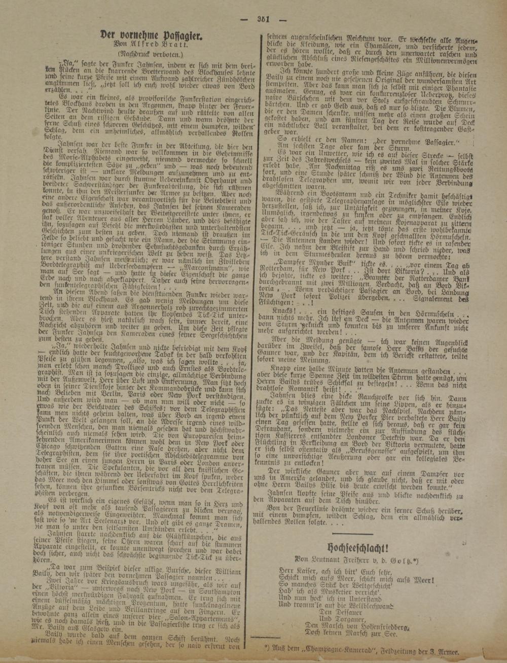 Ötnog wie d?r Beichtvater des Schiffes i vor dem Telegrapfffstcn kann man nichts geheim halten, lvas über Bord an irgend mneu 4dnikt der Welt gelangen soll, an die 9ldresse irgend eines ioild- frelnden Menschen, den man niemals gesehen hat und höchstwahrscheinlich auch Niemals sehkn wird. Tie von Euro Par eisen heimkehrende,l Amerikanerinnen können wohl dem in New Bork oder Chicago schwitzenden Gatten eine Nase drehen, aber nicht de^n U^^histen, deni sie ihre poetischen Wschiedstelegramme von hoher See an emen jungen Herrn in Paris oder London anve^ ttaiien müssen. ^ie Spekulanten, die vor all den kilifflichen Ge- die ihnen wahrend der Ueberfahrt im Kopf spuken^ rveder das Meer noch den Himmel oder sonstwas von Gottes Herrlichkeiten lw!m Sroct" OTUnrtm Börsentricks nicht vo7demRl-g!7-