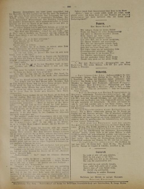 — Das literarische Echo Halbmonatsschrift für Lite- raturfreunde. Verlag: Egon Fleischet L Eo.. Berlin ZV. 9. Das 1. Augnsthest ist soeben mit folgendem Inhalt erschienen: Otto Kiefer: Der Knabe in der Literatur; Edgar Steiger: Alt- München im Spiegel Josef Rnederers; Ferdinand Gregori: Philipp Hafner; Paul Feldkeller: Militärisches und künstlerisches Sehen; Alexander v. Weilen: „Volk in Not". Echo der Zeitungen. — Echo der Zeitschriften. — Echo des Auslandes.
