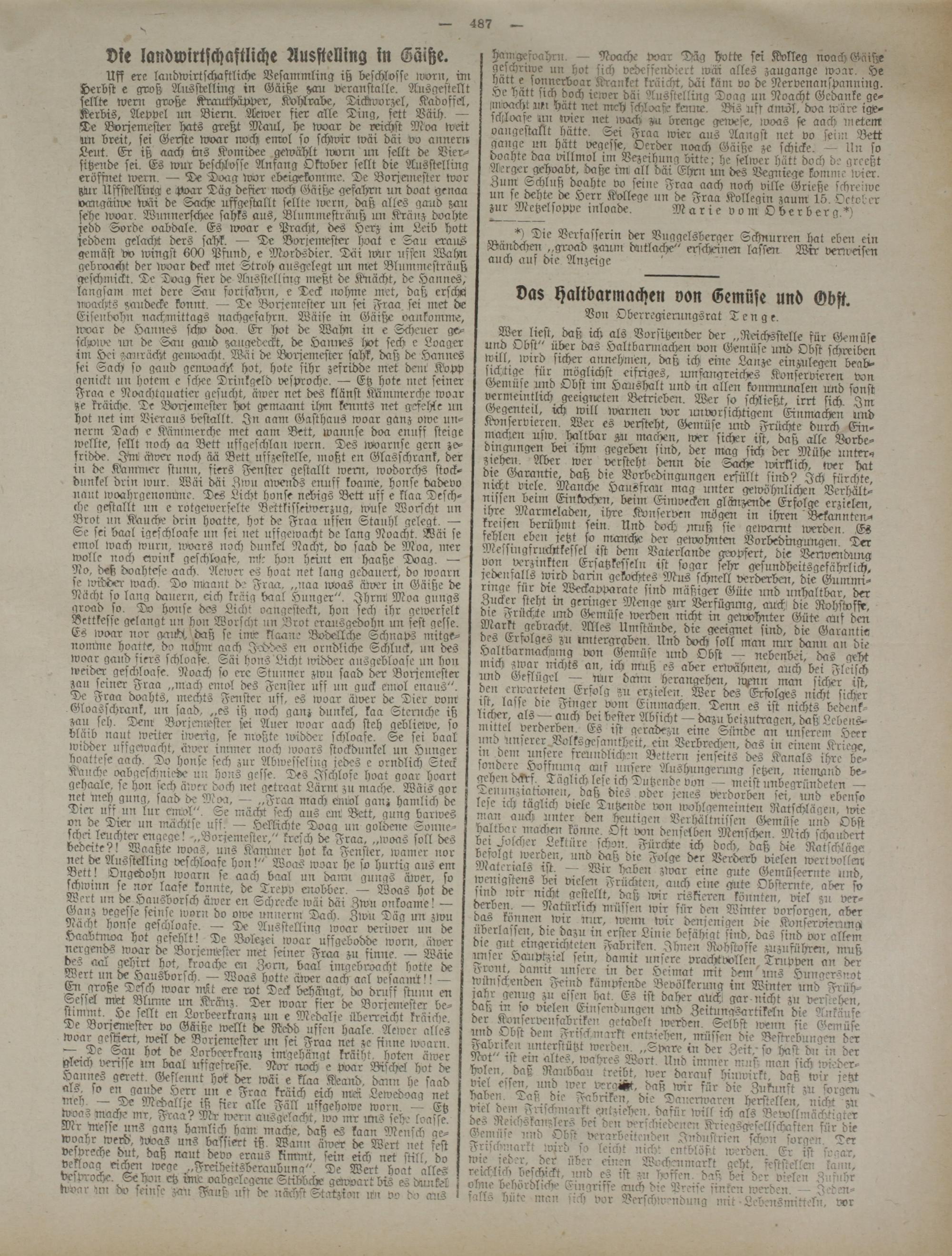 Uff ere landwirtschaftliche Vesammling iß beschlösse worn, im Herbst e groß Airsstelling in Gäiße veranstalle. Ausgestellt selltc wern große Krauähäpt>er, Kolstrabe, Dickworzel, KadoffÄ, Kerbis, Aeppel un Biern. Aewer fier alle Ding, fett Väih. — De Borjemester hats greßt Maul, he tvoar de reichst Moa weit un breit, sei Gerste woar noch emol so schwir tväi däi vo annern Leut. Er iß aach ins Komidee gewählt worn un sollt de Vier- sitzende sei. Es wur beschlösse Anfang Oktober sollt die Ausstelling eröffnet wern. — De Doag wor ebeigekomme. De Borjemester wor Aur UffstelliUg e Poar Tag defter noch Gäiße gefahrn un doat genaa vaugäiwe Wäi de Sache uffgestallt sollte wern, daß alles gaud zau sehe woar. Wunnerschee sahks aus, Blummefträuß un Kränz doalste jedd Sorde oabdale. Es woar e Pracht, des Herz im Leib hott jeddem gelacht ders sahk. — De Vorsemester hoat e Sau erarrs gemäß vo wingst 600 Pffmd, e Mordsdier. Däi Wur uffen Wahn gebiioacht der woar deck inet Stroh ausgelegt un met Blummefträuß geschmickt. De Doag fier de Ausstelling meßt de Knächt, de Hannes, langsam met dere Sau fortfahrn, e Teck nohme met, daß erschg uoachts zaudecke könnt. — De Borjemester un sei Fraa sei met de Eisenbahn nachmittags nachgefahrn. Wäise in Gäiße oankomme, woar de Hannes scho doa. Er hot de Wahr: in e Scheuer ge- fckjsi)li>e im de Sau gaud zangedeckt, de Hamres hot sech e Loager im Hei zaurächt gemoacht. Wäi de Borjemester sahk, daß de Hannes sei Sach so gaud genroaM hot, hote sihr zefridde met denk Kopp genickt un hotem e schee Trinkgeld vesproche. — Etz hote met seiner Fraa e Noachtguatier gesucht, äwer net des llänst Kämmerche woar ze kräiche. De Borjemester Hot gemaant ihm kennts net gefehlt un Hot net im Vieraus bestallt. In aam Gasthaus woar ganz owe un- nerm Dach e Kämmerche met aam Bett, wannse doa enuff steige wellte, sellt noch aa Bett uffgeschlan wern. Des lvoarnse gern ze- fridde. Iäni Äver noch ää Bett uffzestelle, moßt en Glasschrank, der in de Kammer ftunn, fiers Fenster gestallt wern, wodorchs stockdunkel drin wur. Wäi däi Zwu awends enuff koarne, honse dadevo naut woahrgenomme. Des Licht honst nebigs Bett uff e llaa Desch- che gestallt un e rotgewerfelte Bettkisseiwerzug, wuse Worscht un Brot un Kauche drin hoattc, Hot de Fraa uffen Stauhl gelegt. — Se sei baal igeschloafe un sei net uffgewacht de lang Noacht. Wäi se emol wach wurn, uwars noch dunkel Nacht, do saad de Moa, mer wolle noch ewink geschloafe, mft hon heint en haaße Doag. — No. deß doahtese aach. Aewer es hoat net lang gedauert, do woarn se unddei- wach. Do nüaant d? Frcw. „naa woas äwer in Gäiße de Nächt so lang dauern, eich kräig baal Hunger". Jhrni Moa gungs Zroad so. Do honse des Licht oangefteckt, hon sech ihr gewerfelt Bettkesse gelangt un hon Worscht un Brot erausg<d-ohn un fest gesse. Es woar nor cvtirfx daß se ime klaane Bodellche Schnahs mitge- nommc hoatte, do nöhm aach Jeddes en orndliche Schluck, un des woar gaud fiers schloafe. Säi hons Licht tvidder ausgebloase un hon weider geschloafe. Noach so ere Stuuner zwu saad der Borjemester zau seiner Fraa „mach emol des Fenster uff un guck emol enaus". De Fraa doahts, mechts Fenster uff, es woar ä>ver de Dier vom Gloasschrank, un saad, „es ist noch ganz dunkel, kaa Sternche iß zau seh. Dem Borjemester sei Auer woar aach steh gebliewe, so bläib naut weiter iwerig, se moßte tvidder schloafe. Se sei baal Widder nffgewacht, äwer innner noch woars stockdunkel un Hunger boattese aach. Do honse sech zur Abwesseling jedes e orndlich Steck Rauche oabgeschniede un hons gesse. Des Ischlofe hoat goar hoart gehaale, se hon sech ätver doch net getraut Lärm zu mache. Wäis gor net ineh gung, saad de Moa, — „Fraa mach Äniol ganz hamlich de uff un lur emol". Se macht lech aus ent Bett, gung barwes ?u de -vier un mächtse uff. — Hellichte Doag un goldene Sonne- schm leuchter engege„Borjemester," kresch de Fraa, „woas soll des bEe?! Waaßte woas, uns Kamin er hot ka Fenster, wamer nor net de MlsstÄllng veschloafe hon!" Woas woar he so hurtig aus em -üett. Ongevohn woarn se aach baal un dann gungs äwer, so schwmn se nor laufe konnte, de Trepv enobber. — Woas Hot de Wert un de Hausborsch äwer en Schrecke wäi däi Zwu onkoame! — vegesse sernse worn do mve unnerm Dach. Zwn Dag un zwu Nacht honse geschioafe. — De Ausstelling woar veriwer un de Haaotinva hot gefehlt! De Bolezei woar uffgebodde wonr, äwer nergends woar de Borreiwster- met seiner Fraa zu sinne. — Wäre dev am gehrrt Hot, kroack-e an Zarn, ba<fl imgebroacht hotte de Wert un de Hausborsch. — Woas hotte ätoer aach aal vesaamt!! — Desch woar Mt ere rot Deck behängt, do drmff sllmn en Sessel met Bluure un Kräirz. Der woar fier de Borjemester be- Ulmmt. He sellt en Lorbeerkranz un e Medalje überreicht kräiche De Borjemester vo Gäcße,wellt de Redd uffen haale. Aewer alles woar gestiert, weil de Borjemester uir sei Fraa net ze finne woarn.
