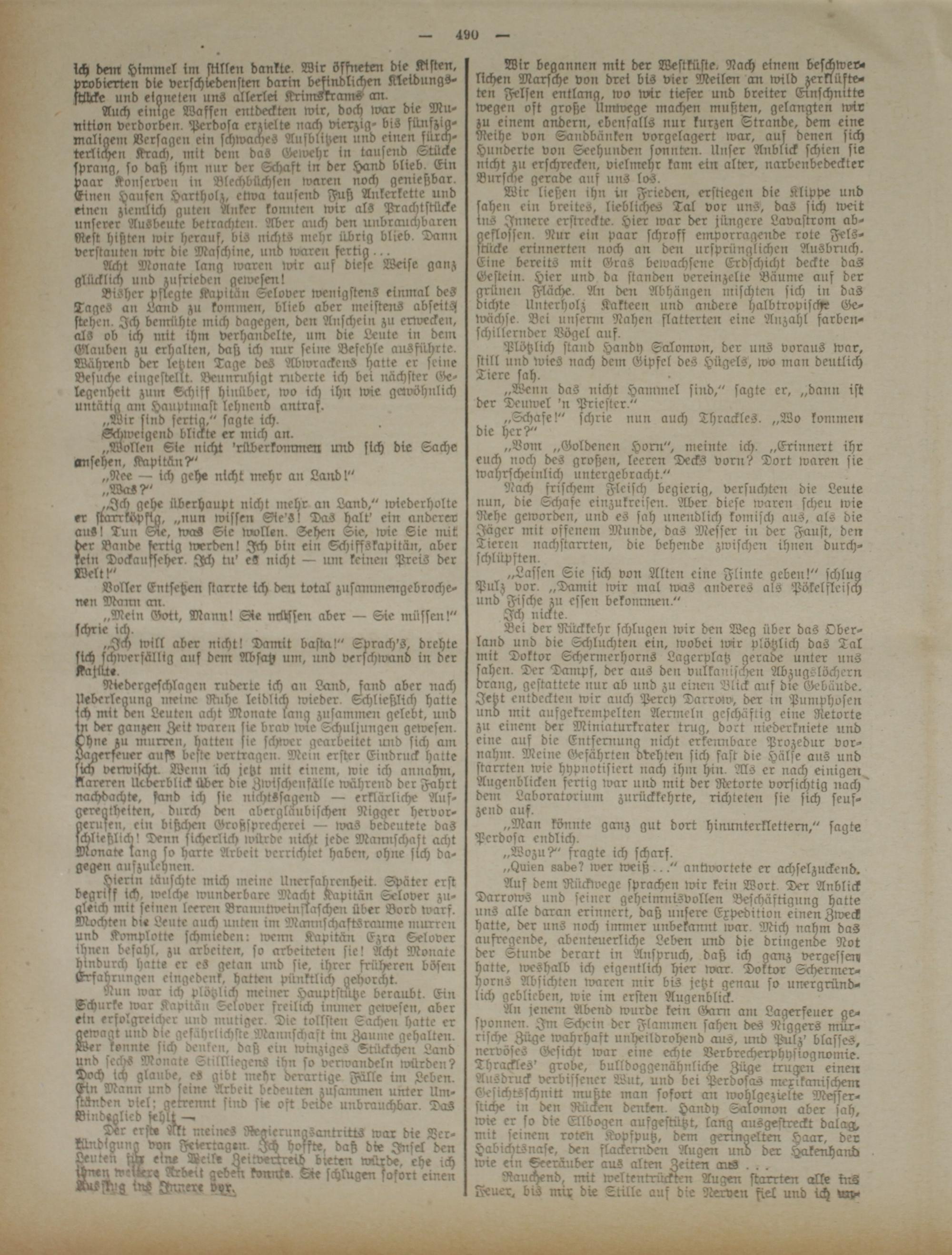 Auf dem Rückwege sprachen wir kein Wort. Der Anblick Darrows und seiner geheimnisvollen Beschäftigung hatte uns alle daran erinnert, daß unsere Expedition einen Zweck hatte, der uns noch immer unbekannt lvar. Mich nahm das aufregende, abenteuerliche Leben und die dringende Not der Stunde derart in Anspruch, daß ich ganz vergessen, hatte, weshalb ich eigentlich hier war. Doktor Schermcr- horns Absichten ivarcn mir bis jetzt genau so unergründlich geblieben, wie im ersten Augenblick.